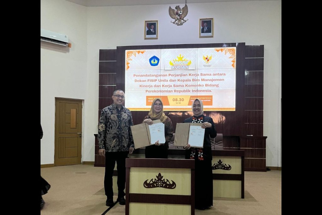 (Unila): Fakultas Ilmu Sosial dan Ilmu Politik (FISIP) Universitas Lampung (Unila) menandatangani Perjanjian Kerja Sama (PKS) dengan Kementerian Koordinator Bidang Perekonomian Republik Indonesia, Jumat, 9 Mei 2025.