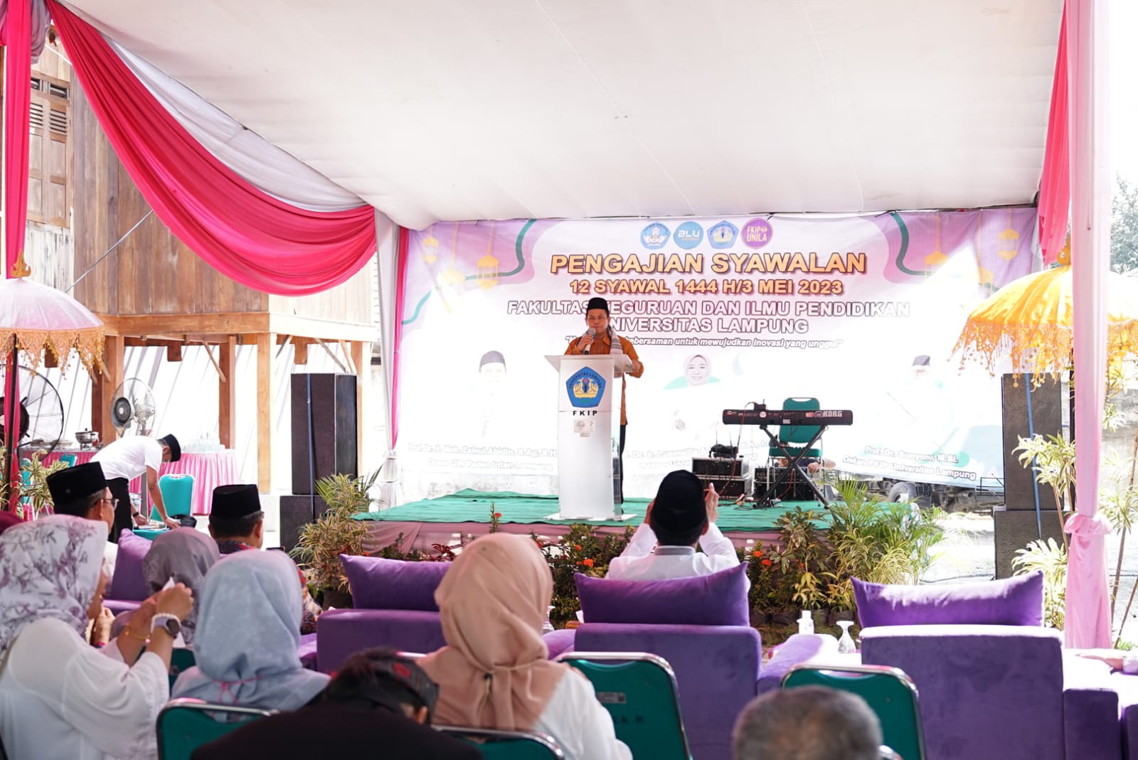 (Unila): Fakultas Keguruan dan Ilmu Pendidikan (FKIP) Universitas Lampung (Unila) mengadakan pengajian bulan syawal 1444 Hijriah di rumah adat Lampung FKIP Unila pada Rabu, 3 Mei 2023.
