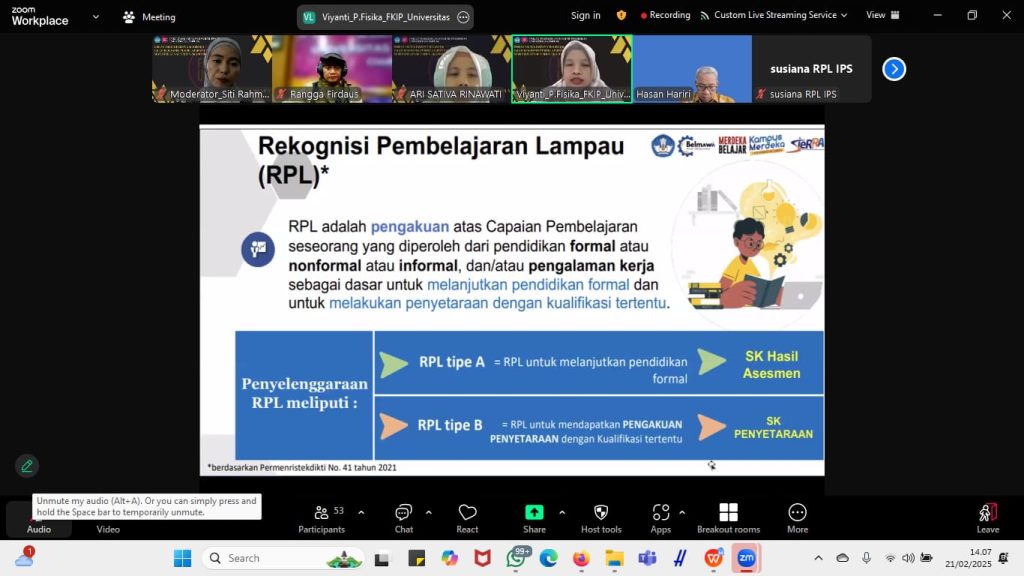 Pengenalan Sistem Akademik Pascasarjana berlangsung pada Jumat, 21 Februari 2025, melalui platform Zoom Meeting dan dihadiri oleh Dekan FKIP UNILA, Dr. Albet Maydiantoro, M.Pd., para Wakil Dekan, Tim RPL Universitas Lampung, Ketua Program Studi (Kaprodi) yang menyelenggarakan jalur RPL, dosen, serta tim pengajar RPL.