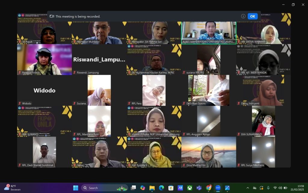 (Unila): Dalam rangka menyambut mahasiswa magister jalur Rekognisi Pembelajaran Lampau (RPL), FKIP Universitas Lampung (Unila) untuk pertama kalinya menyelenggarakan kegiatan Pengenalan Sistem Akademik Pascasarjana (Orientasi) pada mahasiswa baru secara virtual.