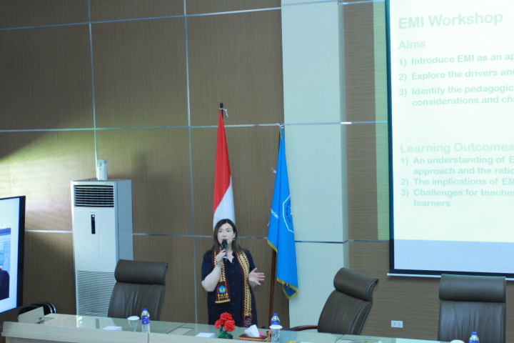 Dr. Angela Farrell dalam sesi penyampaian materi membagikan pengalamannya mengenai peran penting bahasa Inggris sebagai media pengajaran di era globalisasi. Ia juga memaparkan bagaimana UL telah beradaptasi dengan tren pendidikan internasional serta tantangan global di bidang pengajaran bahasa Inggris.
