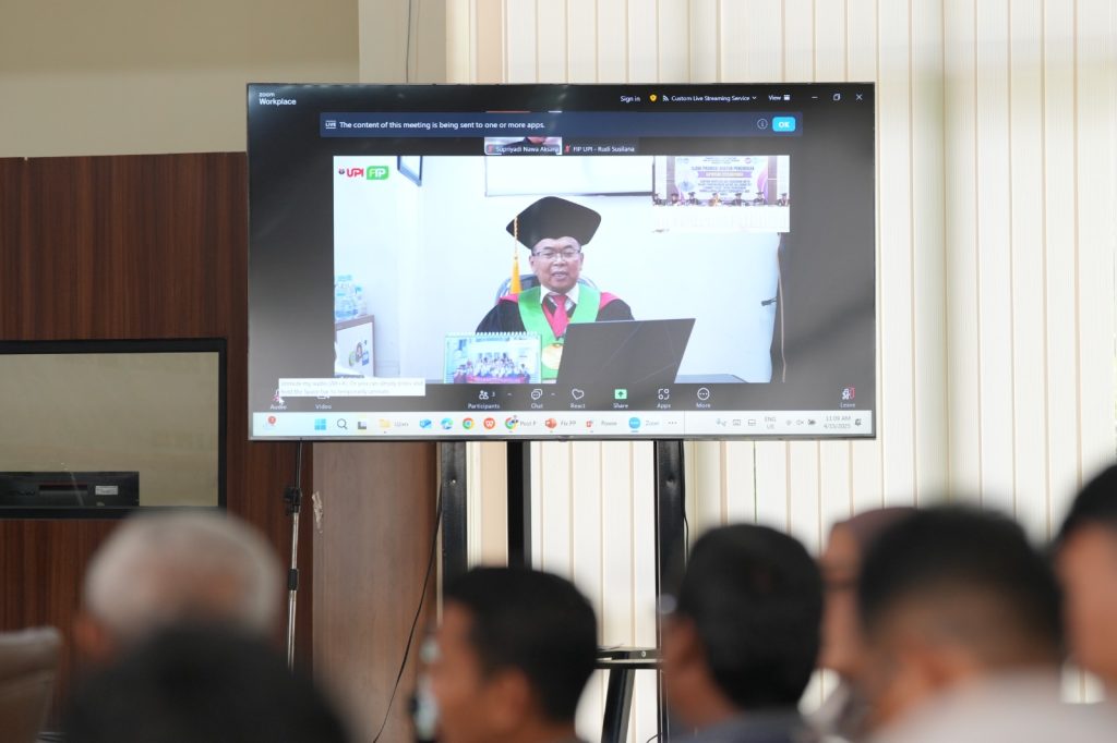 Promovendus Supriyadi mempresentasikan disertasi berjudul “Berpikir Kompleks dan Kesadaran Kritis dalam Pengembangan Online Collaborative Learning Theory untuk Membangun Pembelajaran Inovatif Berorientasi Aksi Kritis”.