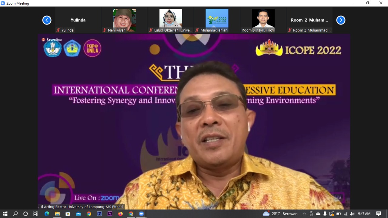 Plt. Rektor Unila Dr. Mohammad Sofwan Effendi, M.Ed., secara daring menyambut baik dan mengucapkan terima kasih atas penyelenggaraan seminar internasional ICOPE ke-4.