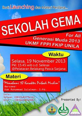GEMA merupakan kegiatan Unit Kegiatan Mahasiswa Fakultas Forum Pembinaan dan Pengkajian Islam (UKMF FPPI) untuk mahasiswa baru FKIP 2013. Materi perdana bertema “Memahami 10 karakter pribadi Muslim”. Materi ini akan dibawakan oleh Muhammad Sulaiman,S.Pd.[] Hisna C