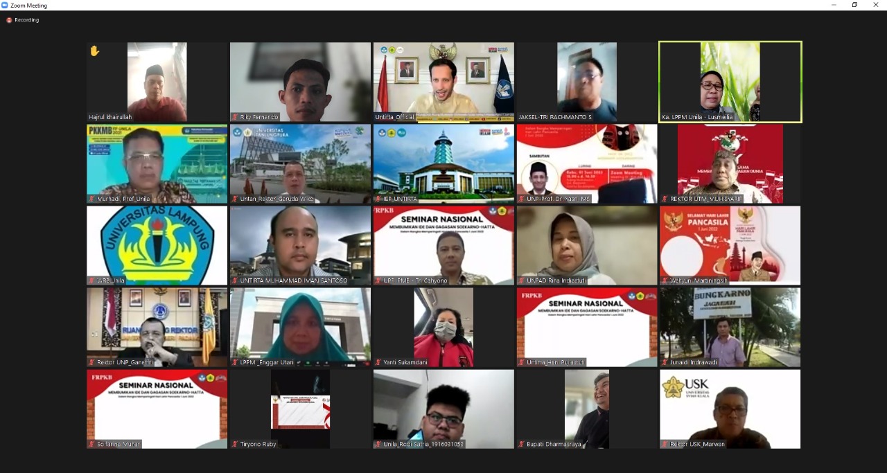 (Unila): Dalam rangka memperingati Hari Lahir Pancasila pada 1 Juni 2022, Forum Rektor Penguat Karakter Bangsa (FRPKB) mempersembahkan Seminar Kebangsaan bertajuk Membumikan Ide dan Gagasan Soekarno-Hatta.