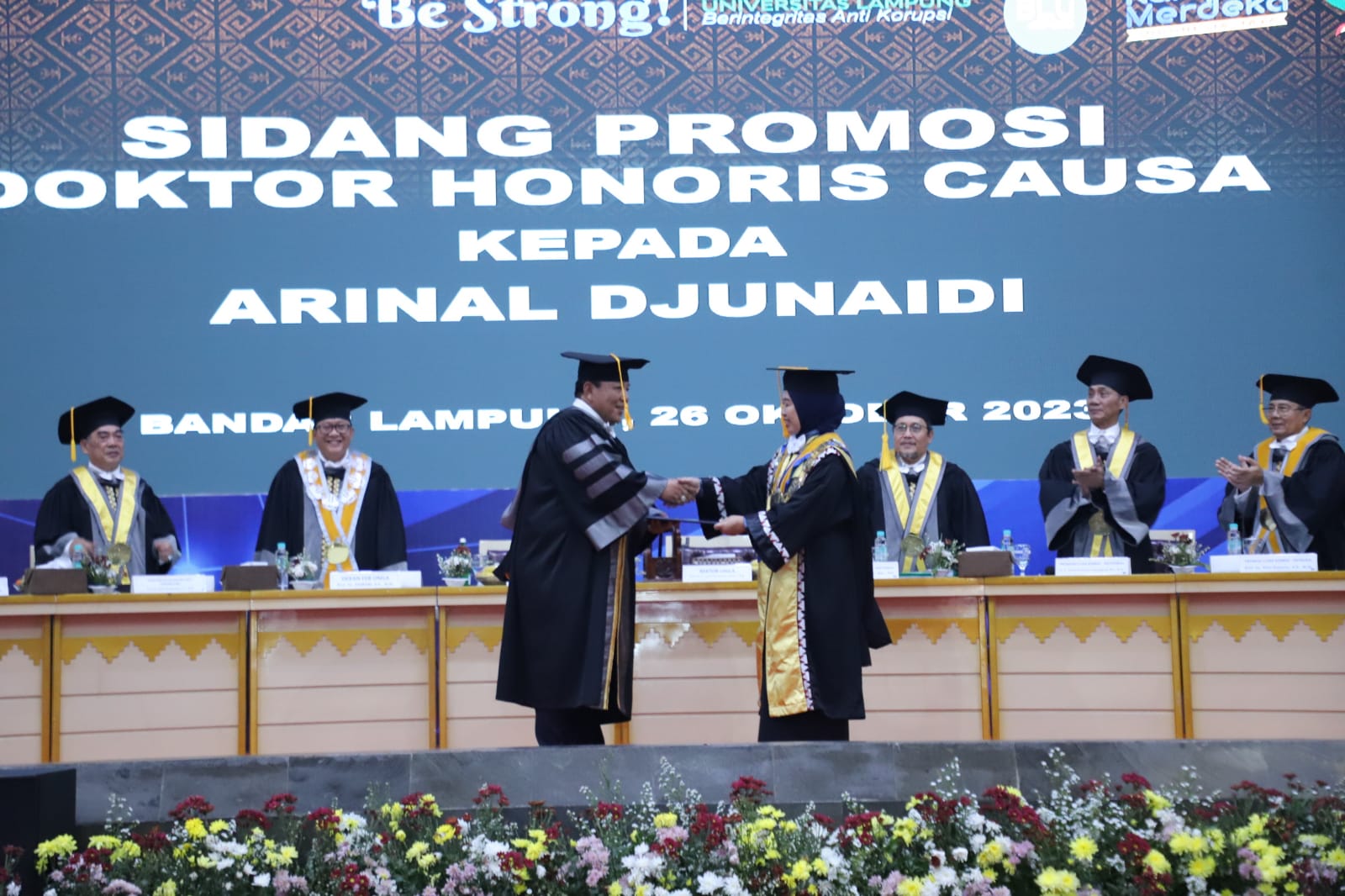 (Unila): Universitas Lampung (Unila) untuk pertama kalinya menyumbangkan seorang Doktor Honoris Causa (H.C.) kepada Negara Republik Indonesia. Gelar Doktor H.C., diberikan Unila kepada Gubernur Lampung Ir. Arinal Djunaidi, dalam Sidang Promosi Doktor Honoris Causa, di Gedung Serbaguna Unila, Kamis, 26 Oktober 2023.