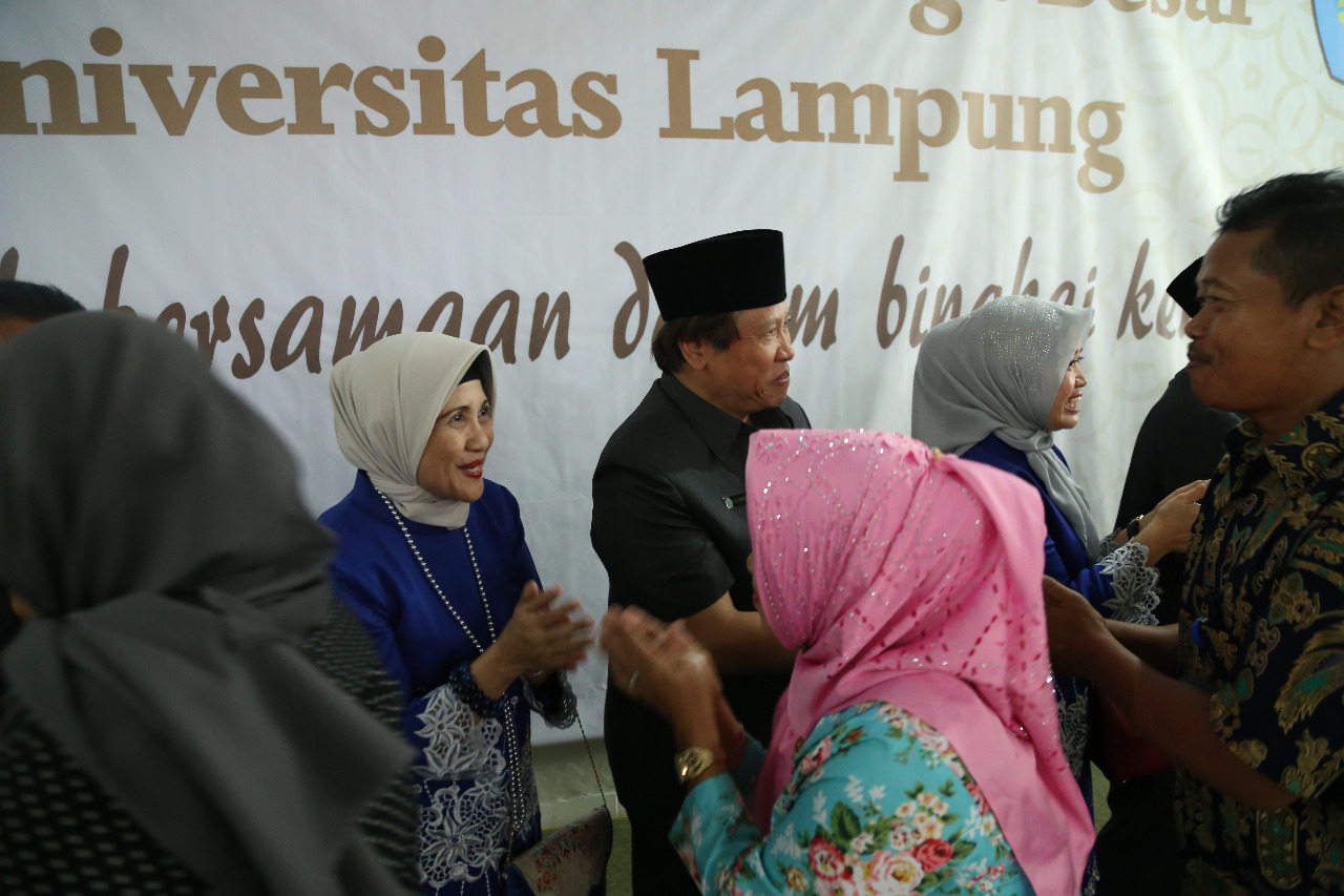 Tampak hadir pada kesempatan itu Rektor Unila Prof. Hasriadi Mat Akin, Wakil Rektor Bidang Administrasi Umum dan Keuangan Prof. Muhammad Kamal, Wakil Rektor Bidang Kemahasiswaan dan Alumni Prof. Karomani, Wakil Rektor Bidang PK-TIK Prof. Muhammad Kufepaksi, para dekan, wakil dekan, kepala biro, unit kerja, tenaga pendidik dan kependidikan Unila.