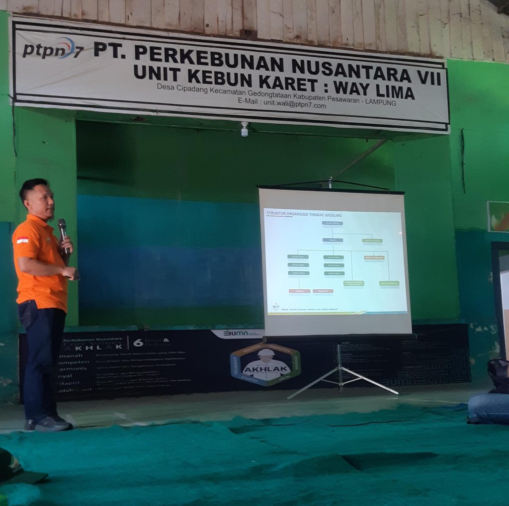 Acara dilanjutkan dengan penyampaian materi mengenai profil dan prospek kerja di PTPN 1 Regional 7 Unit Way Lima oleh Ifal selaku Asisten Kepala Tanaman, terkait sejarah PTPN, struktur organisasi, prospek kerja PTPN, dan manajemen kebun.