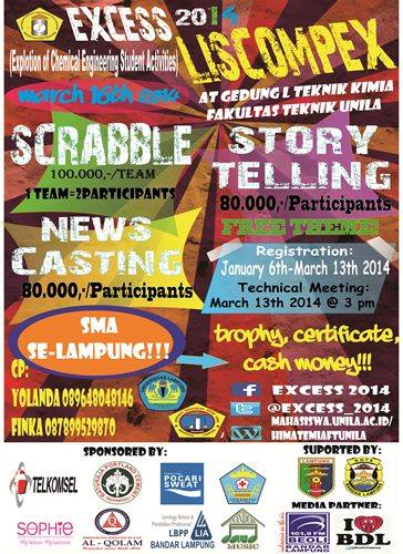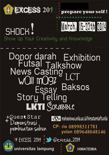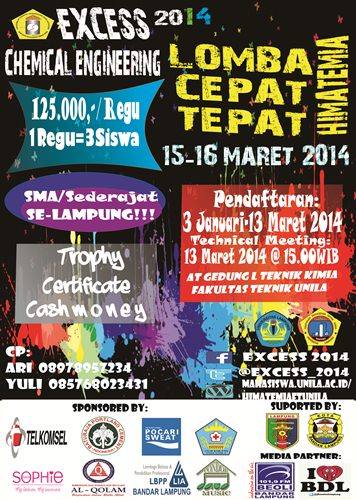 (Unila) : Himpunan Mahasiswa Teknik Kimia Universitas Lampung (Himatemia Unila) menggelar Explotion of Chemical Engineering Student Activities (EXCESS) 2014. EXCESS merupakan serangkaian kegiatan yang dibuka sejak Januari hingga Maret 2014.