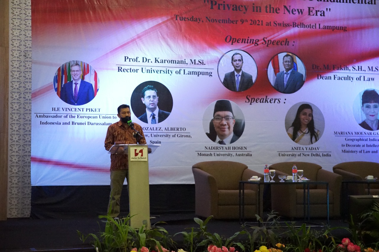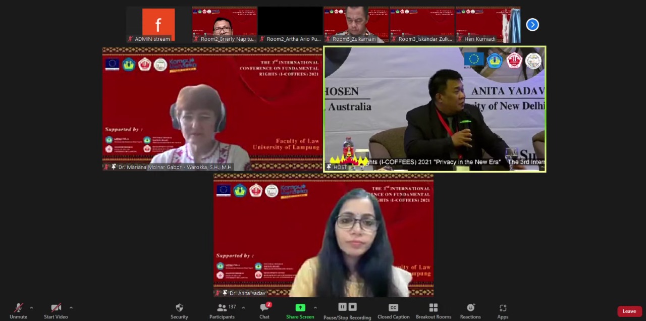 Pada penyelenggaraan tahun ketiga ini, I-Coffees 2021 mengusung tema “Privacy in the New Era” dan dibuka secara resmi Wakil Rektor Bidang Akademik Prof. Dr. Heryandi, S.H., M.S. Acara turut dihadiri dekan fakultas hukum, ketua LPPM, dan jajaran pimpinan di lingkungan Unila.