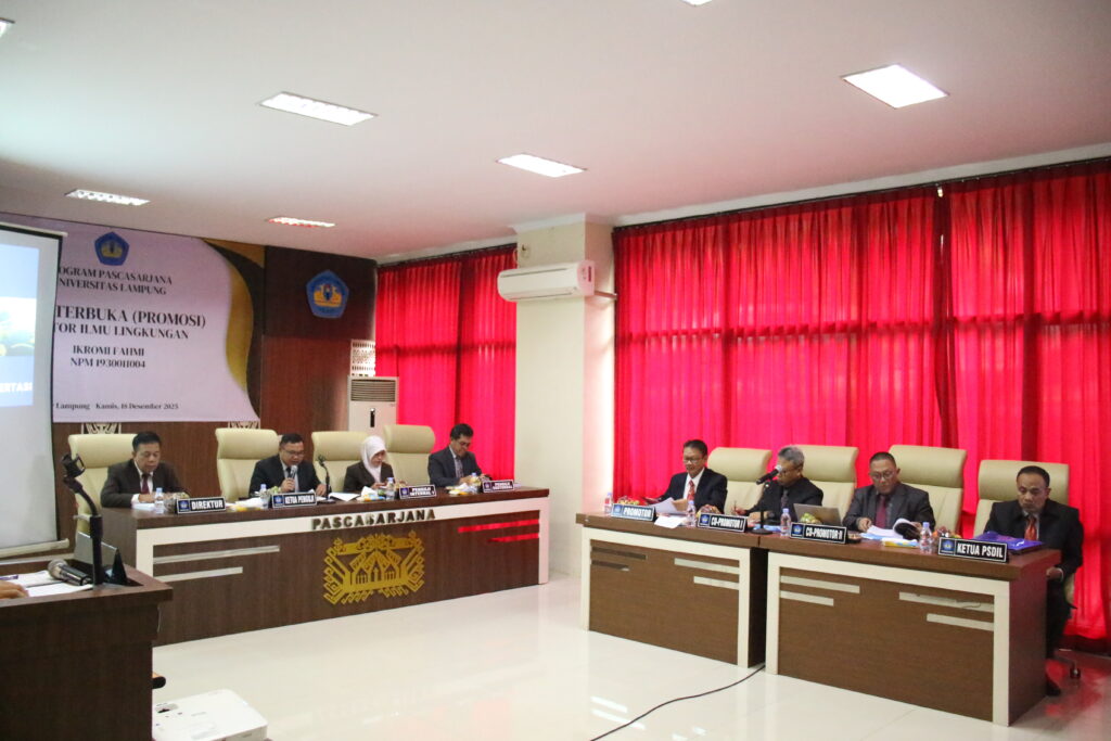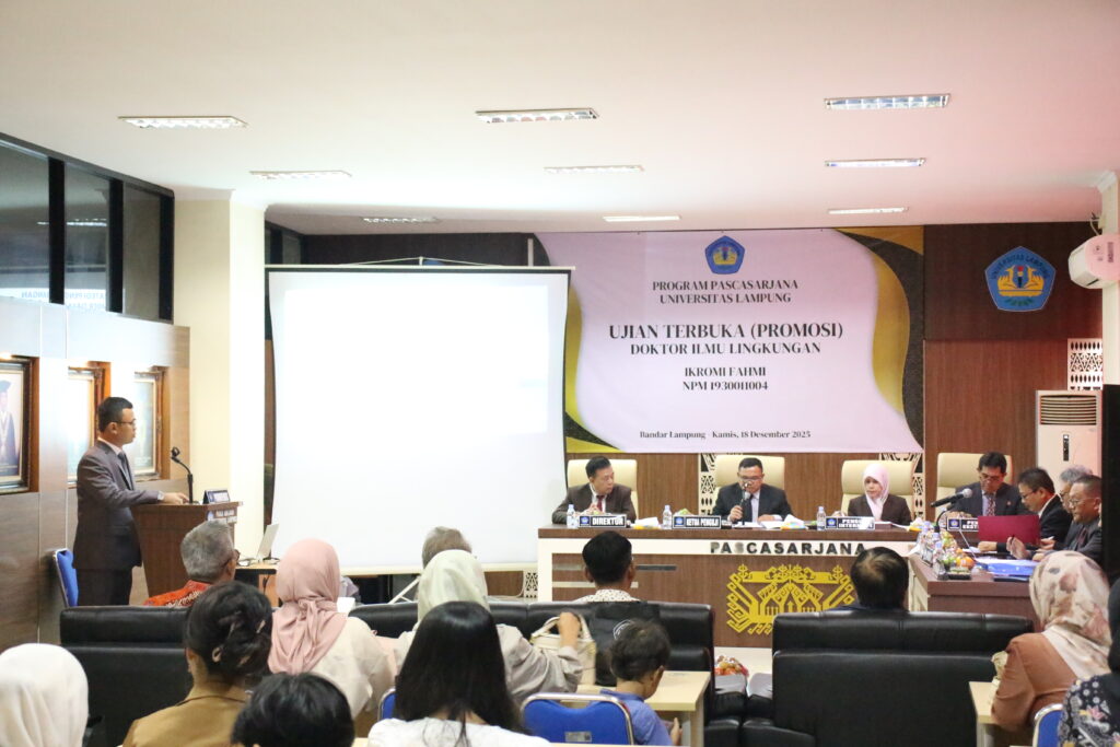 (Unila): Program Doktor Ilmu Lingkungan Pascasarjana Multidisiplin Universitas Lampung (Unila) menggelar Ujian Terbuka Promosi Doktor di Ruang Seminar Doktor Ilmu Lingkungan Unila, Kamis, 18 Desember 2025.