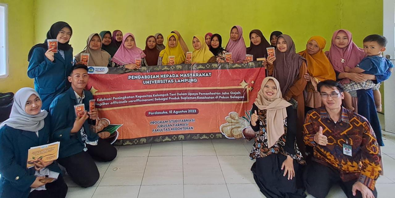 Kegiatan PKM bertujuan untuk peningkatan kapasitas kepompok tani, yaitu dengan memberikan edukasi kepada Kelompok Tani Jaya Lestari di Pekon Selapan, Kecamatan Pardasuka, Kabupaten Pringsewu, dalam upaya pemanfaatan jahe gajah (Zingiber officinale varofficinarum) sebagai suplemen kesehatan.