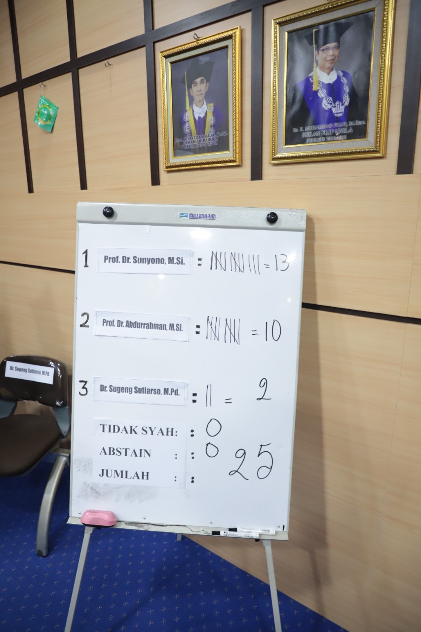 Terpilihnya Prof. Dr. Sunyono, M.Si., sebagai Dekan FKIP Unila usai mengantongi 13 suara. Sementara kandidat lainnya, Prof. Dr. Abdurrahman, M.Si., memperoleh sepuluh suara, disusul Dr. Sugeng Sutiarso, M.Pd., dua suara.