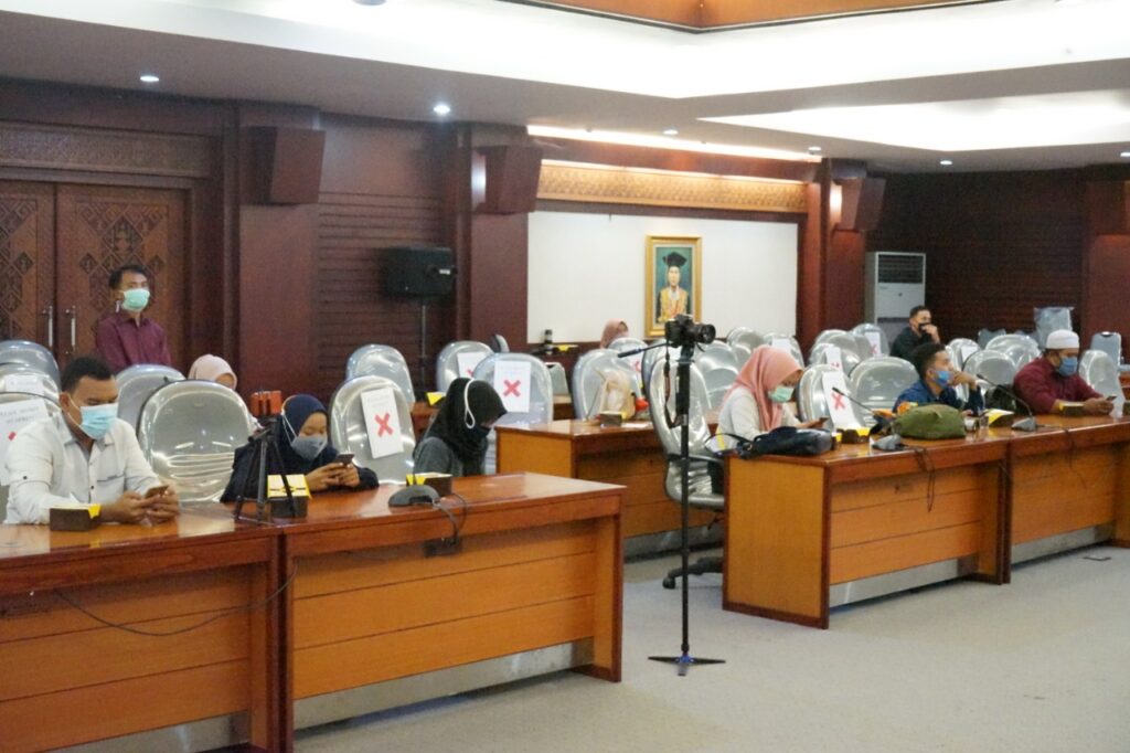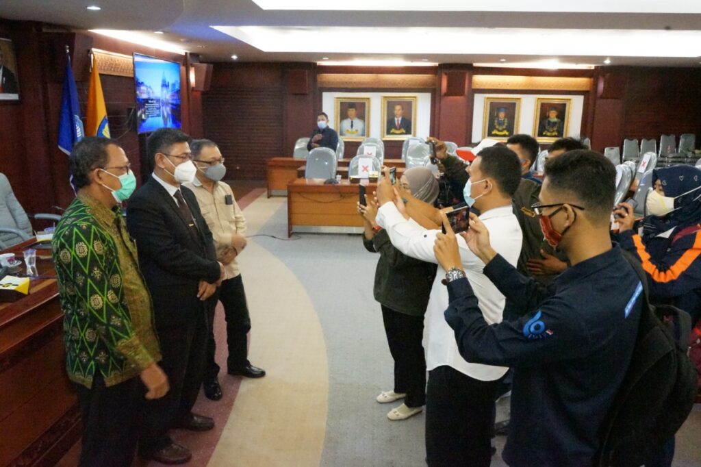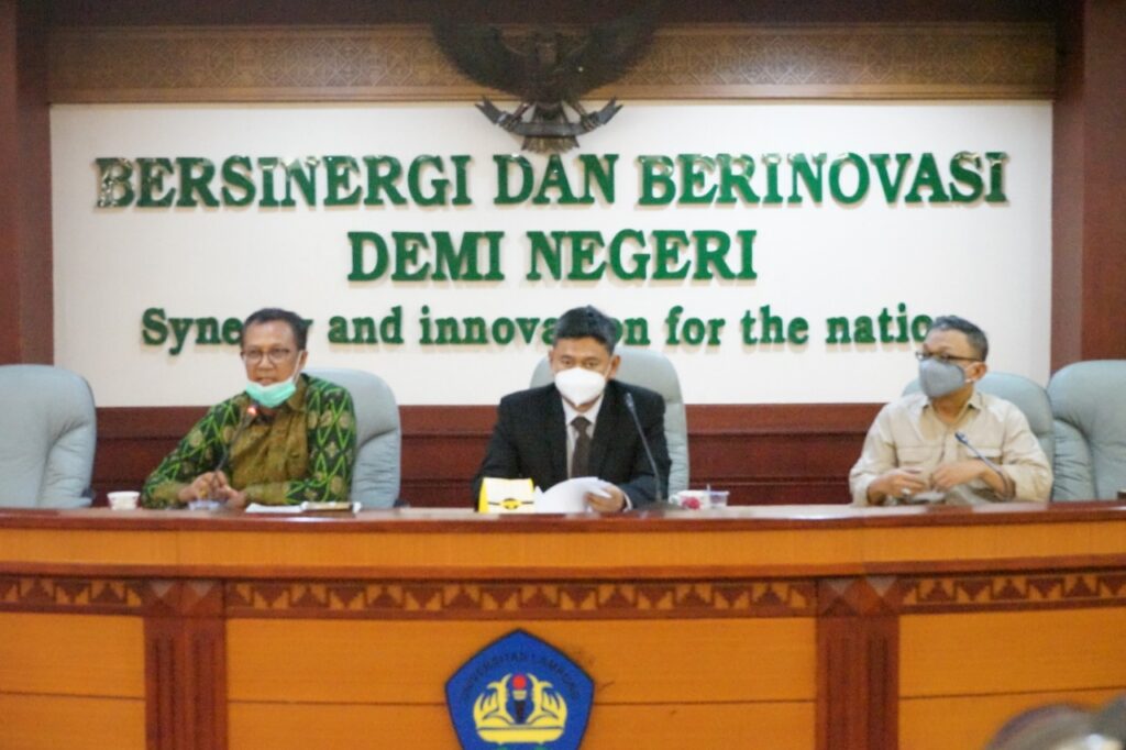 (Unila): Universitas Lampung (Unila) mengadakan Konferensi Pers Penanganan Covid-19 di Lingkungan Unila, di ruang sidang utama lantai 2, Rektorat, Unila, Senin (23/11/2020). Turut hadir Wakil Rektor Bidang Umum dan Keuangan Unila Dr. dr. Asep Sukohar, M.Kes., dan juru bicara (jubir) Rektor Unila Dr. Nanang Trenggono, M.Si., dan Drs. Kahfie Nazaruddin, serta sejumlah awak media cetak dan elektronik. []
