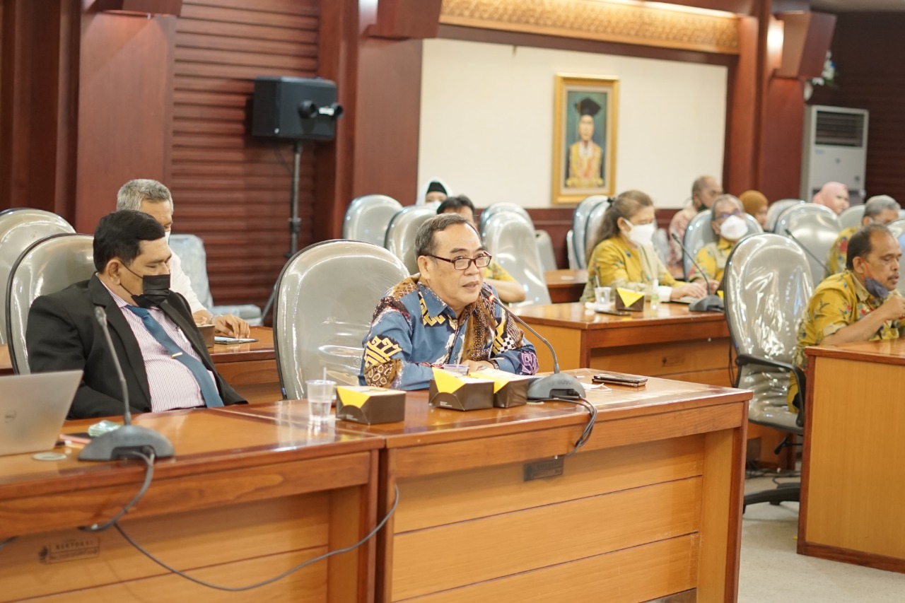 (Unila): Ketua Senat Universitas Lampung (Unila) Dr. (can) Muhammad Basri, S.Pd., M.Pd., beserta jajaran menerima kunjungan kerja Senat Politeknik Negeri Jakarta (PNJ), Senin, 22 November 2021.