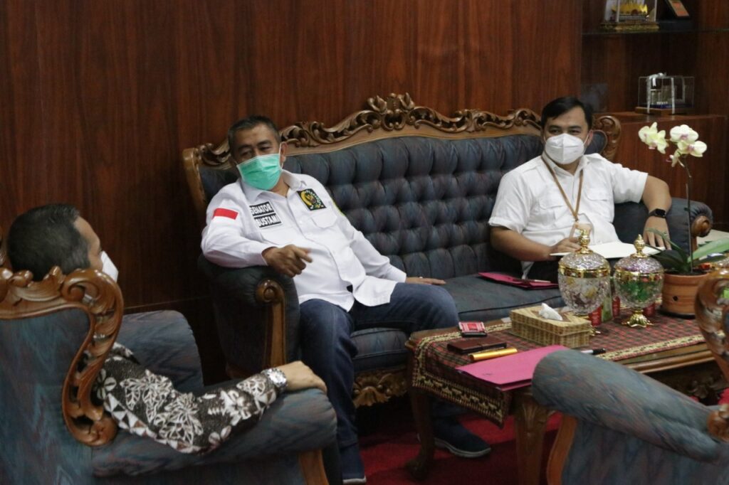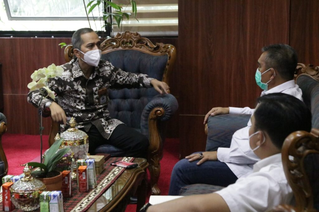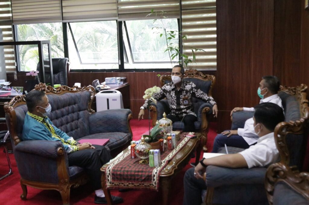 (Unila): Rektor Universitas Lampung (Unila) Prof. Dr. Karomani, M.Si., menerima kunjungan kerja Senator DPD RI Bustami Zainuddin, di ruang kerja rektor, Kamis, 25 Februari 2021. Pada pertemuan itu, Unila dan pihak DPD RI membahas kerja sama pembangunan hunian dan bisnis yang rencananya berlokasi di sekitar Gedung Judo Unila. []