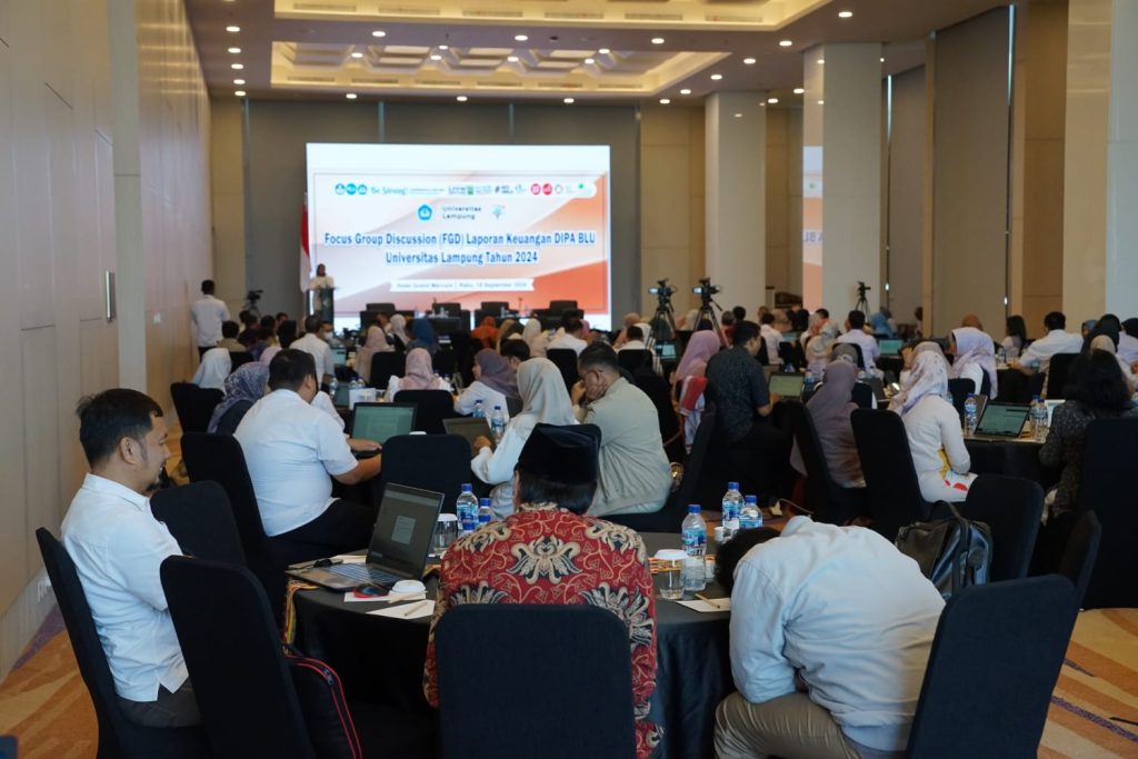 (Unila): Lembaga Penelitian dan Pengabdian kepada Masyarakat (LPPM) Universitas Lampung (Unila) menyelenggarakan focus group discussion (FGD) laporan keuangan DIPA BLU Unila tahun 2024, di Saphire Ballroom Hotel Grand Mercure Lampung, Rabu pagi, 18 September 2024.