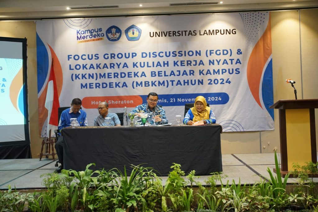 (Unila): Lembaga Penelitian dan Pengabdian kepada Masyarakat (LPPM) Universitas Lampung (Unila) menyelenggarakan focus group discussion (FGD) dan kokakarya terkait Kuliah Kerja Nyata (KKN) Merdeka Belajar Kampus Merdeka (MBKM) tahun 2024, pada Kamis, 21 November 2024, di Ballroom Hotel Sheraton.