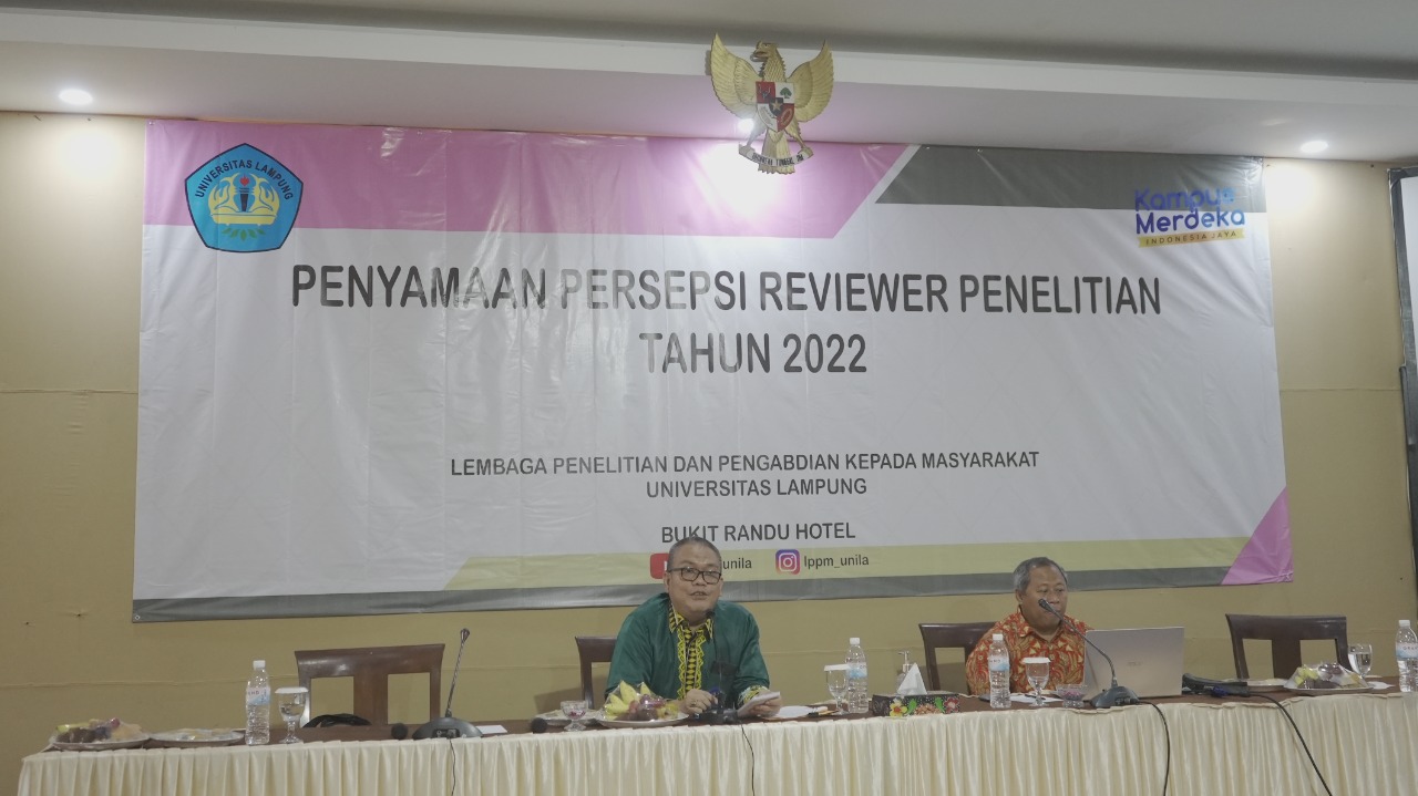 (Unila): Lembaga Penelitian dan Pengabdian kepada Masyarakat (LPPM) Universitas Lampung (Unila) menggelar workshop Penyamaan Persepsi Reviewer Lembaga Penelitian dan Pengabdian kepada Masyarakat Universitas Lampung Tahun 2022. Kegiatan berlangsung di Hotel Bukit Randu, Kamis, 31 Maret 2022.