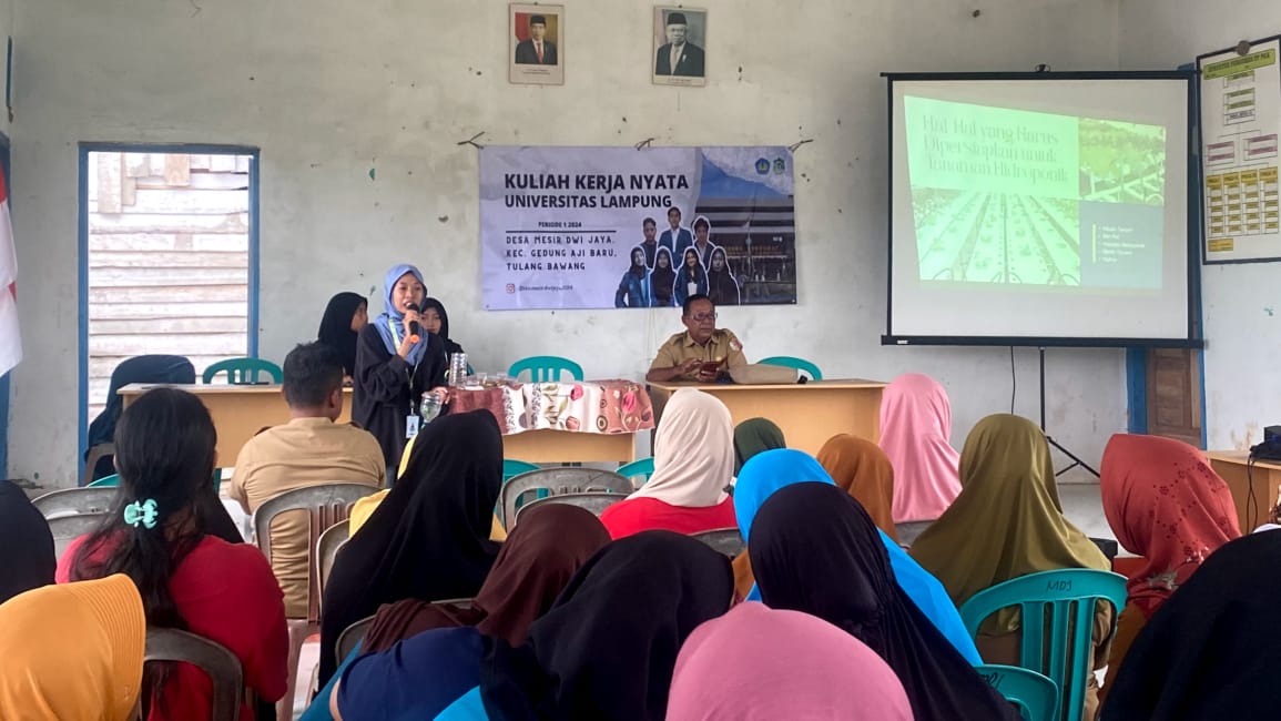 (Unila): Kelompok mahasiswa Kuliah Kerja Nyata (KKN) Universitas Lampung (Unila) periode I tahun 2024 beri pelatihan penanaman sayur hidroponik di Desa Mesir Dwi Jaya, Kecamatan Gedung Aji Baru, Kabupaten Tulang Bawang, Provinsi Lampung pada Selasa, 30 Januari 2024.