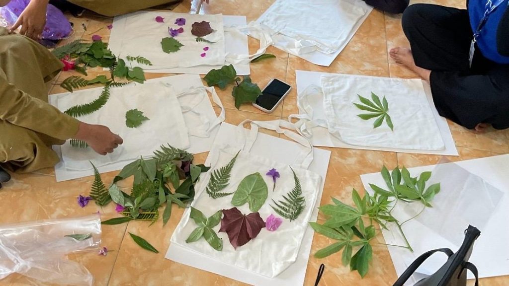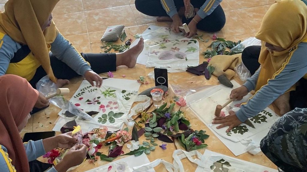 Dengan bahan-bahan yang mudah dijangkau, ibu-ibu diajarkan langkah-langkah eco printing, mulai dari menyiapkan kalender bekas sebagai alas, menyusun bunga dan daun yang sudah disiapkan di atas totebag dengan semenarik mungkin, hingga memukul daun dan bunga tersebut dengan batu beberapa menit agar berubah warna.