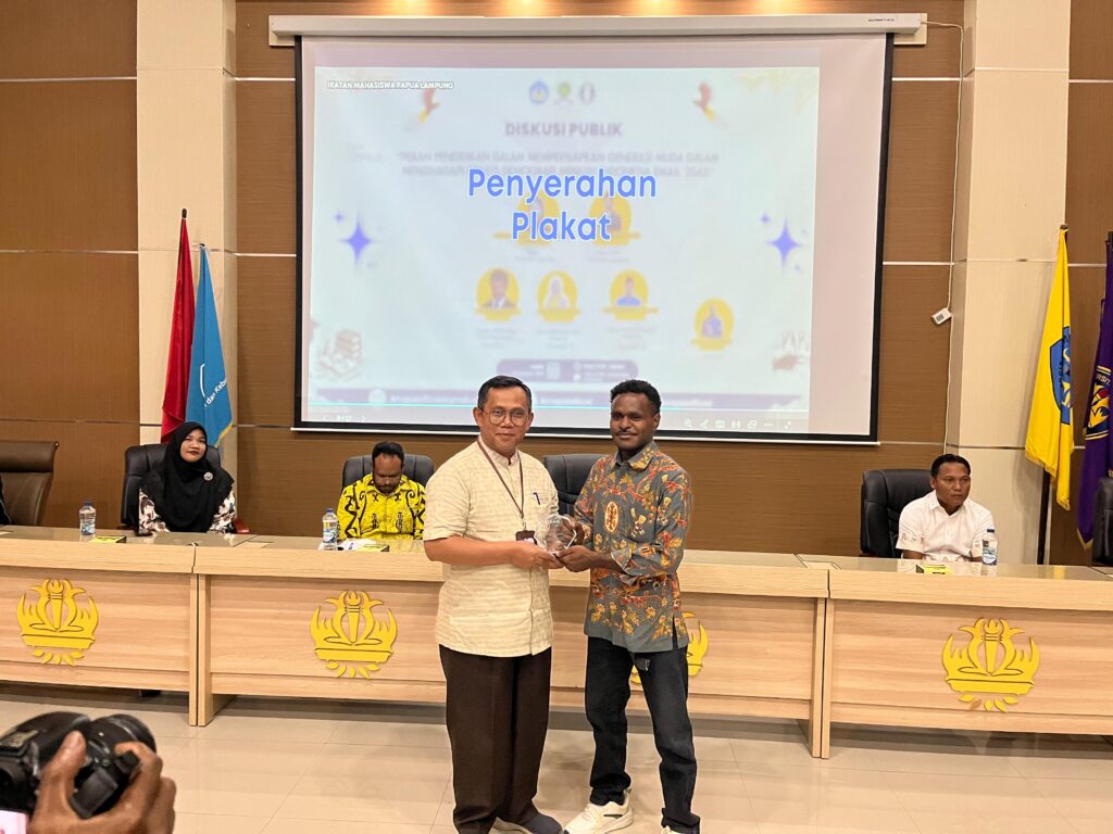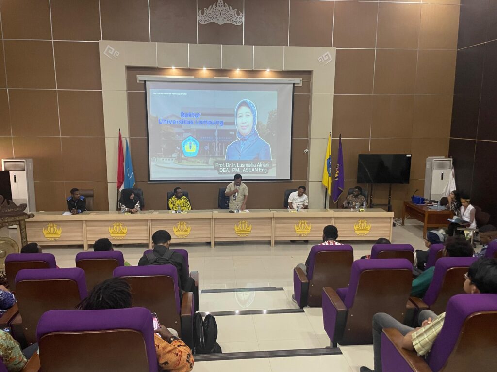 Acara ini menghadirkan narasumber anggota DPD RI Dapil Papua Pegunungan, Arianto Kogoya, S.E., dosen FKIP Unila, Meri Herlina, S.Pd., M.Pd., serta ketua DPD KNPI Provinsi Lampung, Iqbal Ardiansyah, S.Si., M.M.