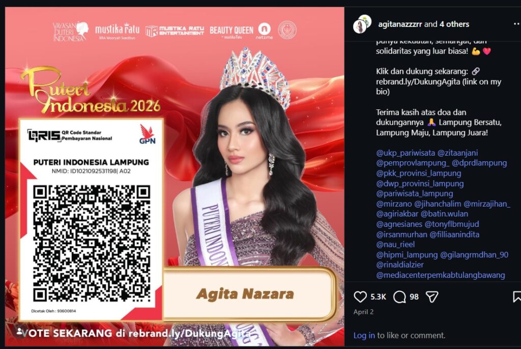 (Unila): Agita Azara, mahasiswi berprestasi dari Fakultas Kedokteran Universitas Lampung (Unila) berhasil menorehkan prestasi membanggakan dalam ajang bergengsi Puteri Indonesia 2026. Perwakilan Provinsi Lampung pada pemilihan Puteri Indonesia ini sukses mencuri perhatian dengan masuk dalam jajaran Top 3 Best Traditional Costume.