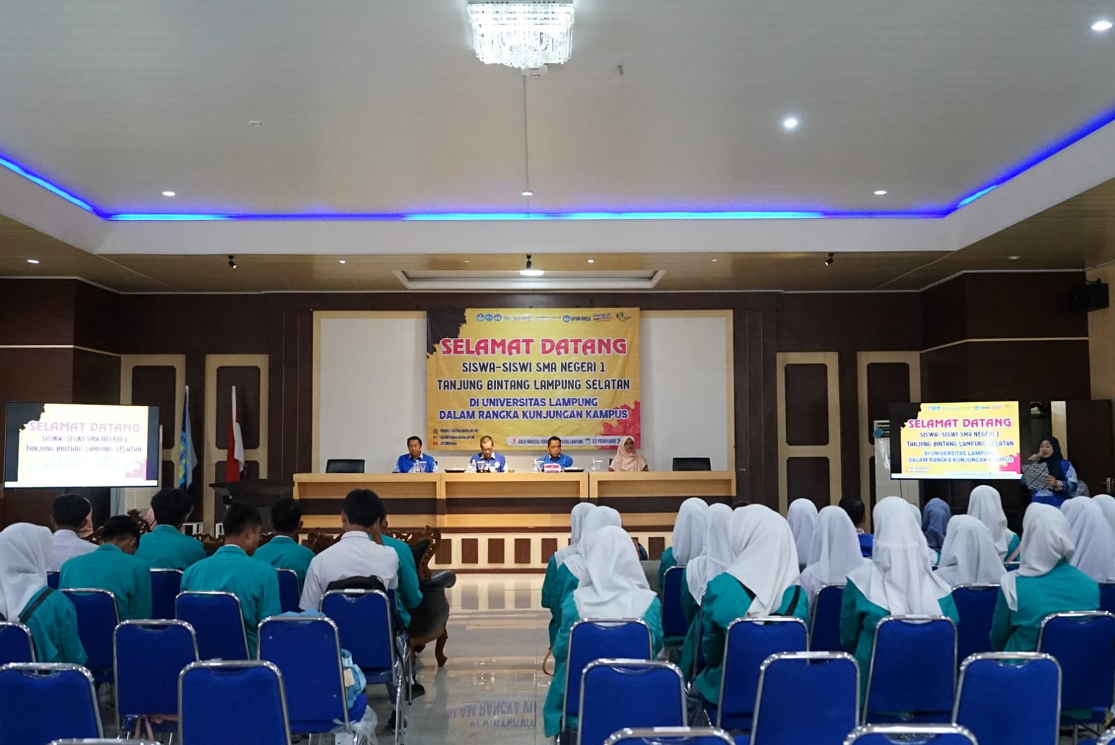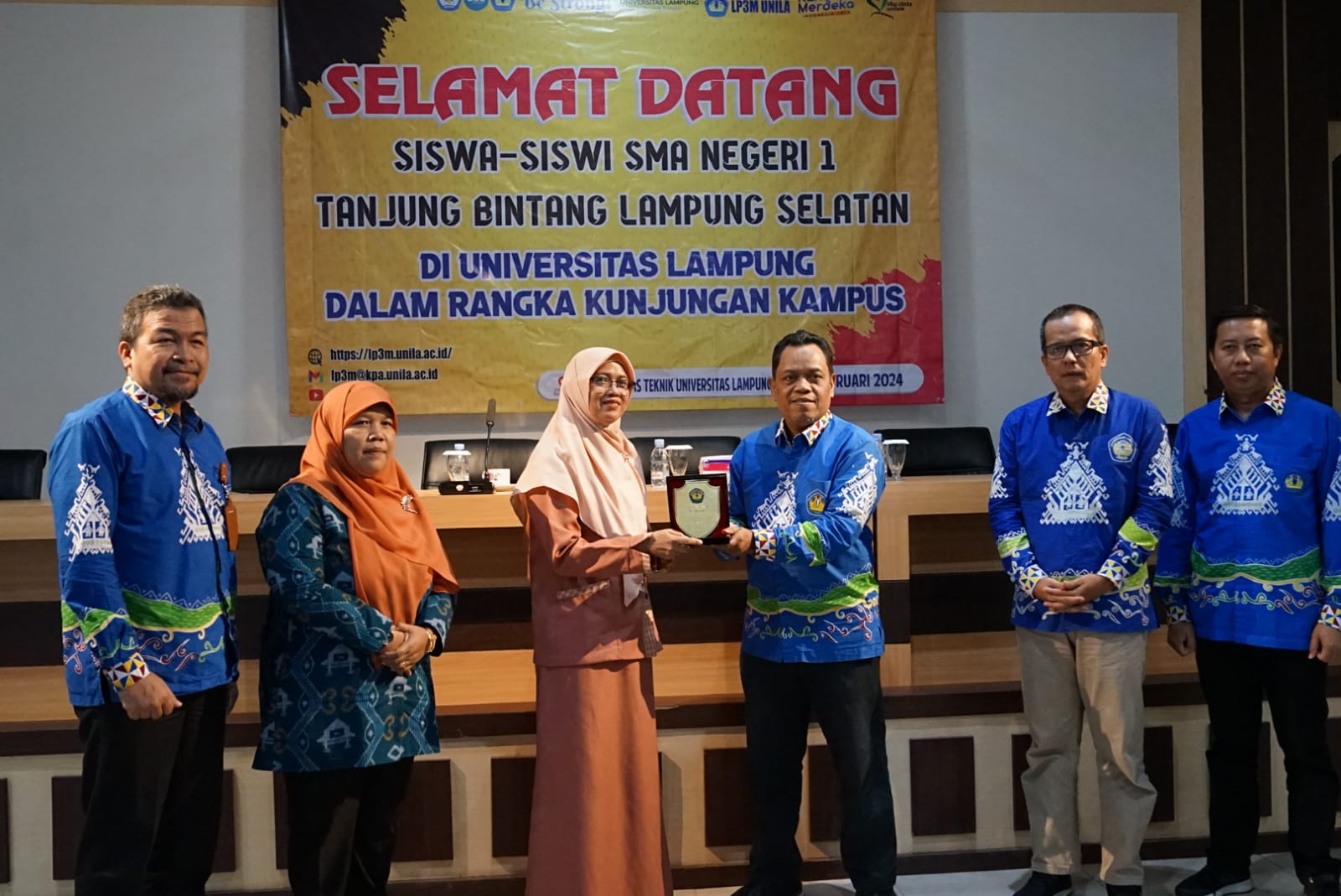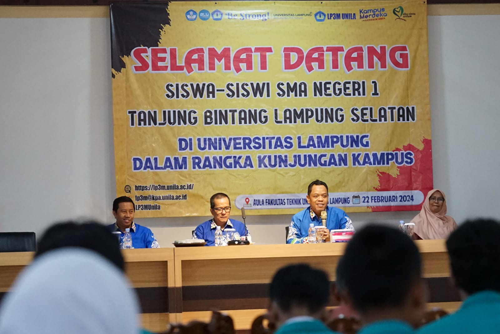 (Unila): Universitas Lampung (Unila) menerima kunjungan kampus siswa dan guru SMA Negeri 1 Tanjung Bintang, Lampung Selatan, di Aula Dekanat Fakultas Teknik (FT) Unila, Kamis, 22 Februari 2024.