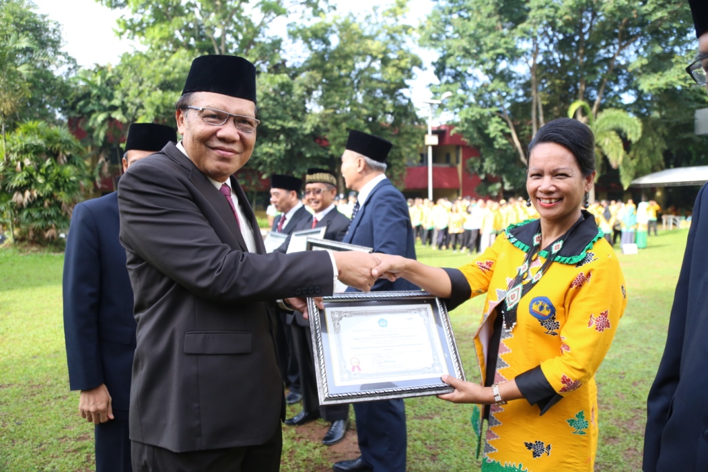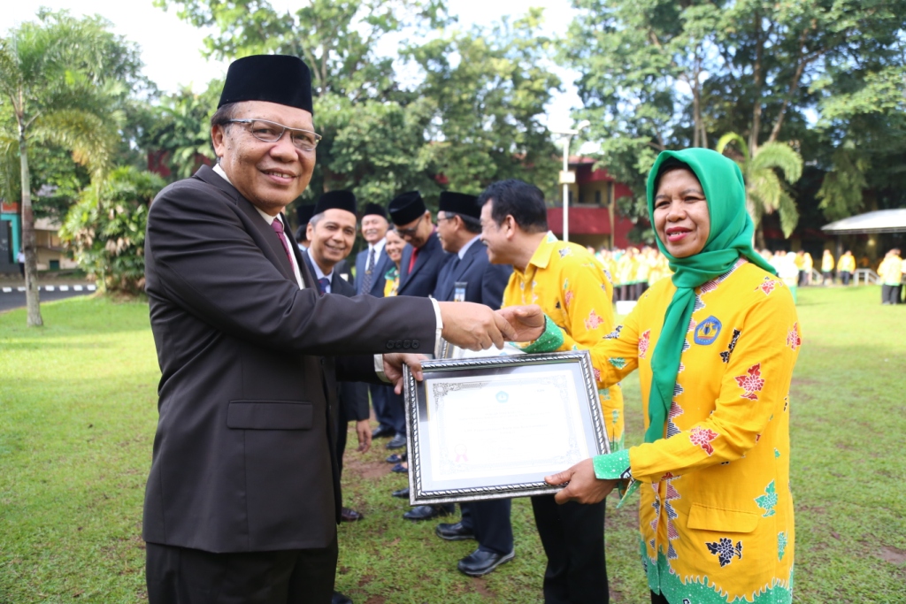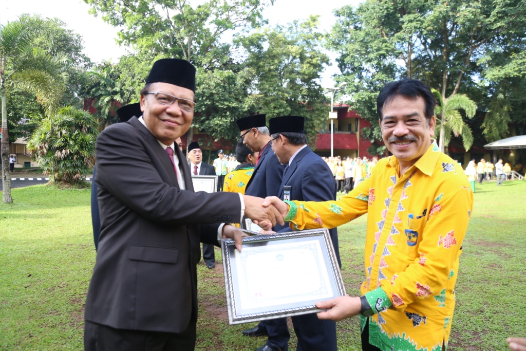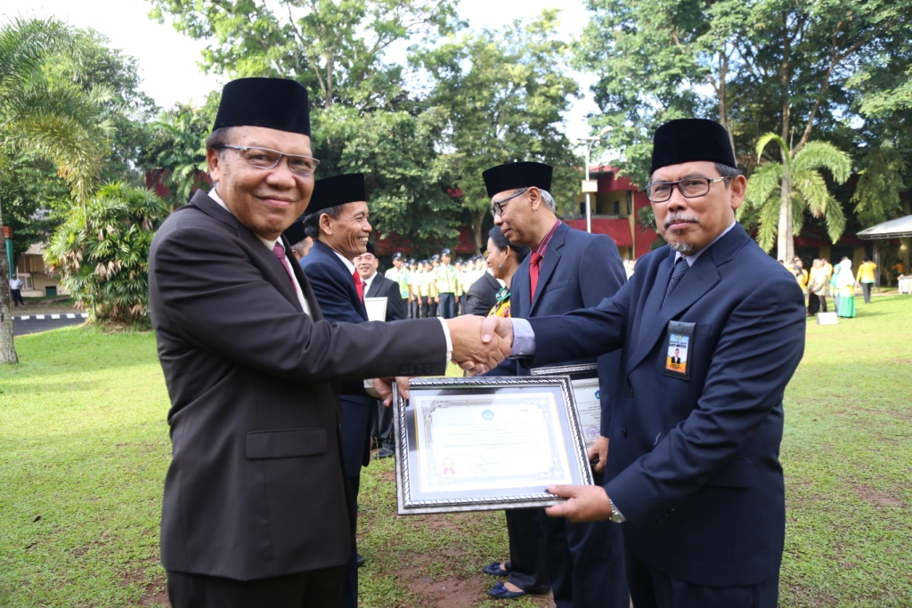 (Unila): Rektor Universitas Lampung Prof. Hasriadi Mat Akin berikan sejumlah penghargaan Capaian Kinerja Terbaik Tahun Anggaran 2018 ke sejumlah unit kerja. Pemberian penghargaan dilakukan usai upacara bulanan ASN Unila di lapangan belakang Rektorat, Kamis (17/1/2019) pagi.