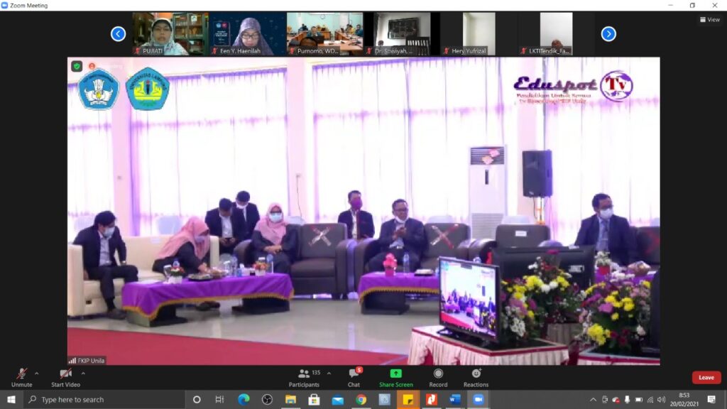 Acara tersebut dilaksanakan melalui dua model, luring dan daring. Panitia dan pimpinan FKIP Unila menghadiri secara luring dengan protokol kesehatan ketat, peserta lainnya mengikuti melalui Zoom maupun Live YouTube Streaming.