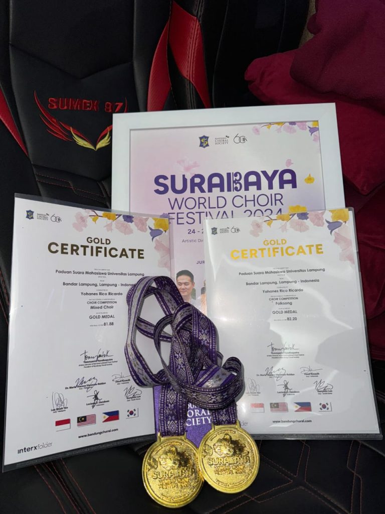 (Unila): Paduan Suara Mahasiswa (PSM) Universitas Lampung (Unila) berhasil meraih prestasi membanggakan dengan mendapatkan medali emas dalam kategori Mixed Choir dan kategori Folk Song pada ajang Surabaya World Choir Festival 2024 yang berlangsung di Balai Pemuda Surabaya, pada Jumat 27 September 2024