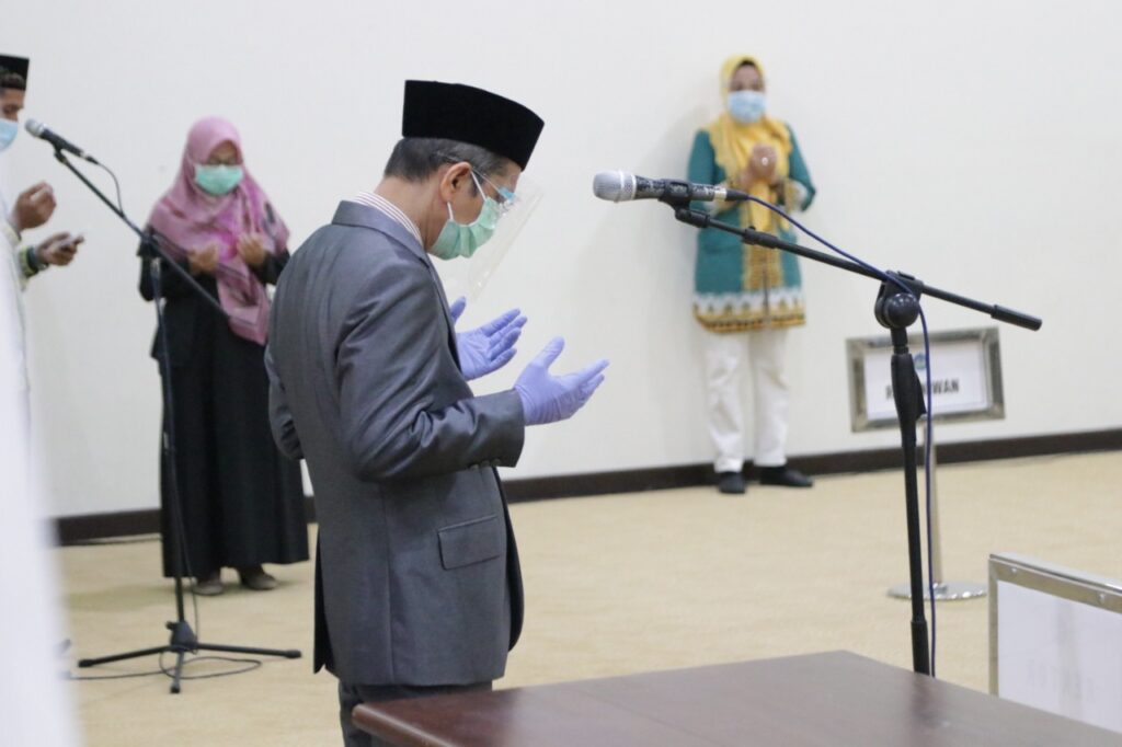 Pelantikan dan pengambilan sumpah jabatan dilaksanakan secara tatap muka di Ruang Pelantikan Rektorat lantai 4 dengan tetap menerapkan protokol kesehatan Covid-19, dan secara virtual menggunakan aplikasi Zoom Meeting. []