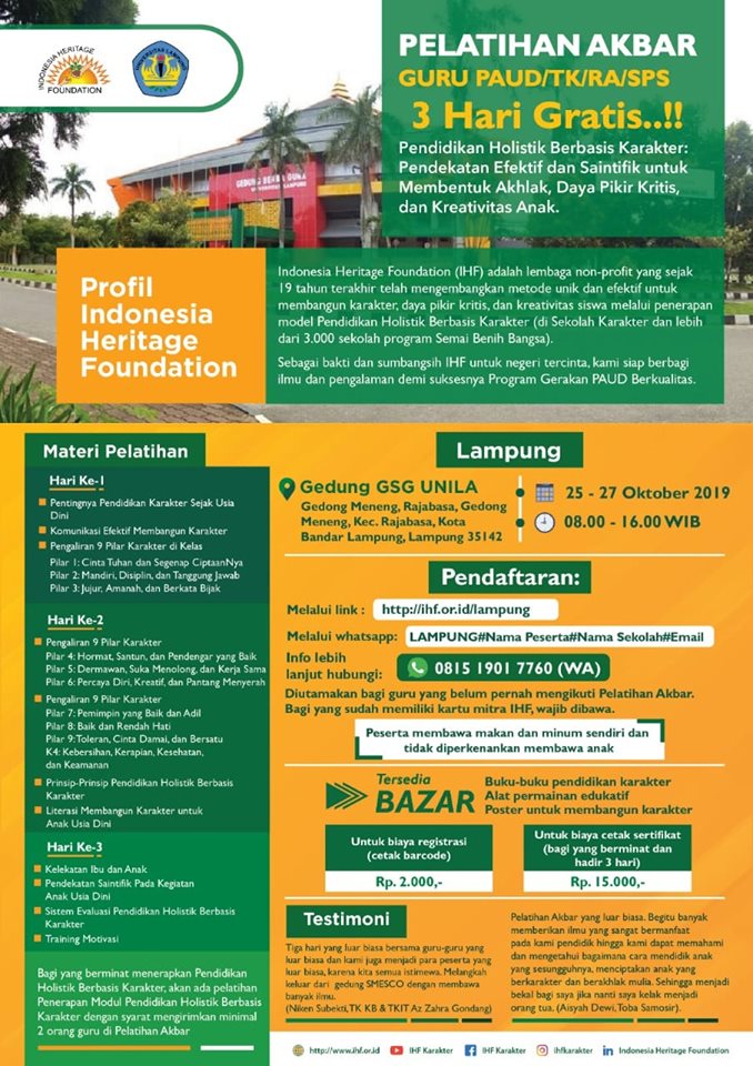 Pelatihan Akbar ini terselenggara atas kerja sama LPPM Universitas Lampung (LPPM UNILA) dengan Indonesia Heritage Foundation (IHF). Pelatihan Akbar telah dilaksanakan sejak tahun 2016 dan dihadiri lebih dari 68.000 guru di berbagai kota di Indonesia. IHF sebagai tim penyelenggara telah berkecimpung dalam pengembangan metode Pendidikan Holistik Berbasis Karakter (PHBK) selama lebih dari 19 tahun.