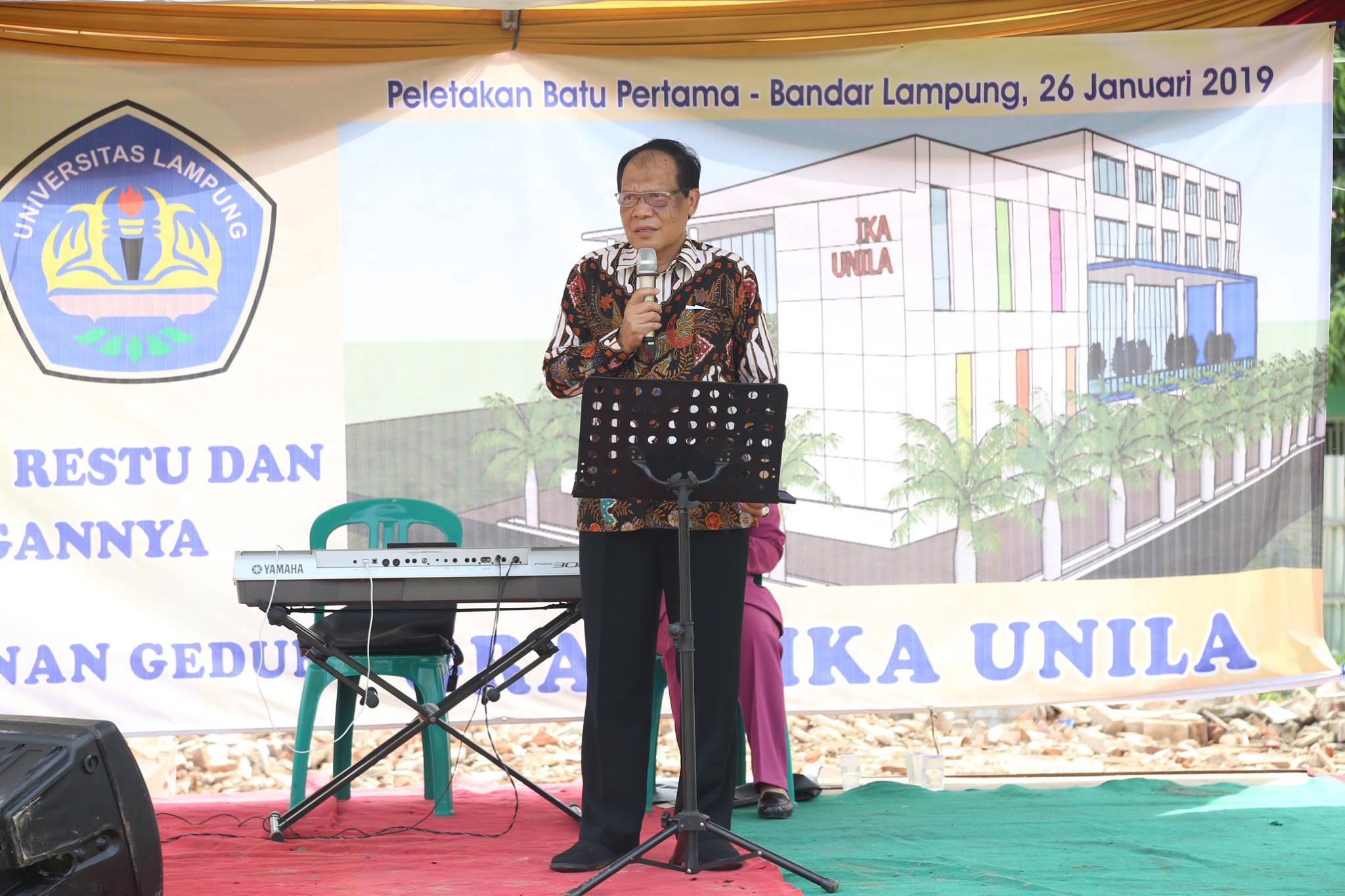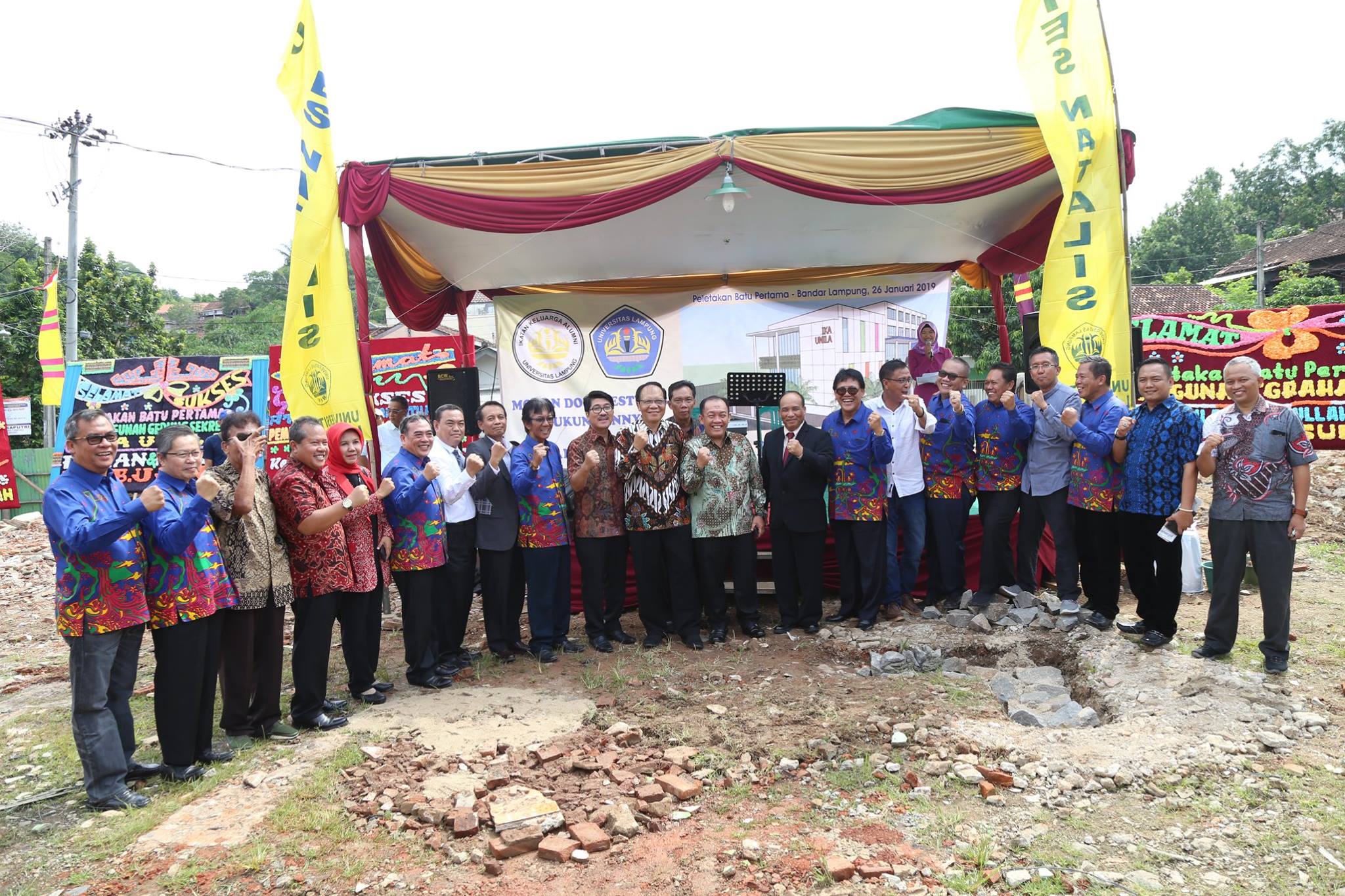 (Unila): Rektor Universitas Lampung Prof. Dr. Ir. Hasriadi Mat Akin, M.P., melakukan peletakan batu pertama pembangunan Gedung Sekretariat Ikatan Keluarga Alumni (IKA) Universitas Lampung di Jalan Sisingamangaraja, Gedong Air, Bandarlampung, Sabtu (26/01/2019).