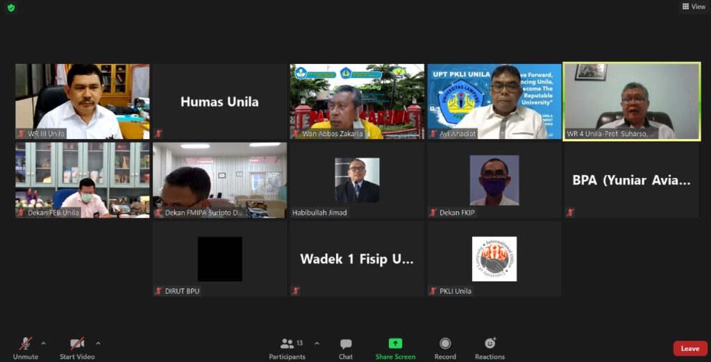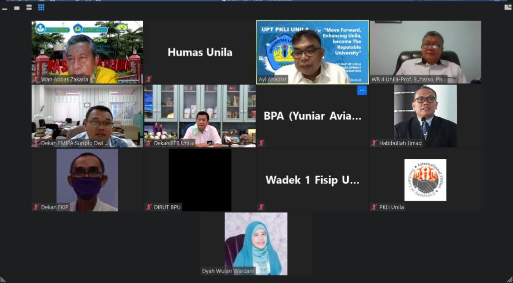 (Unila): Wakil Rektor Bidang Perencanaan, Kerja Sama, dan TIK Prof. Suharso, Ph.D., bersama UPT PKLI Universitas Lampung (Unila) menggelar pertemuan virtual untuk membahas rencana kerja sama dengan PT GGP Tbk, Rabu, 10 Maret 2021, via Zoom.