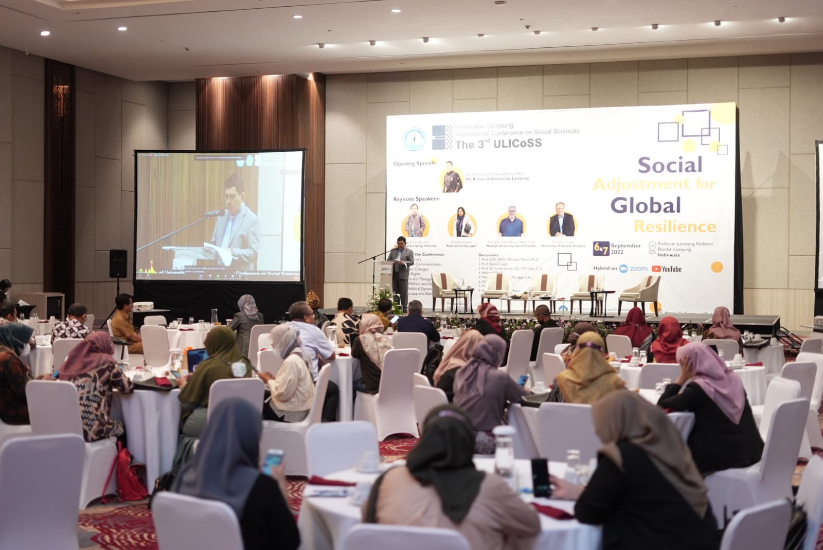 Acara bertajuk Social Adjustment for Global Resilience dan Environmental Issue and Sustainabilty in the Digital Age dibuka secara resmi Wakil Rektor Bidang Kemahasiswaan dan Alumni Unila Prof. Dr. Yulianto, M.S., mewakili Plt. Rektor Unila Dr. Mohammad Sofwan Effendi, M.Ed., di Hotel Radisson, Bandarlampung.