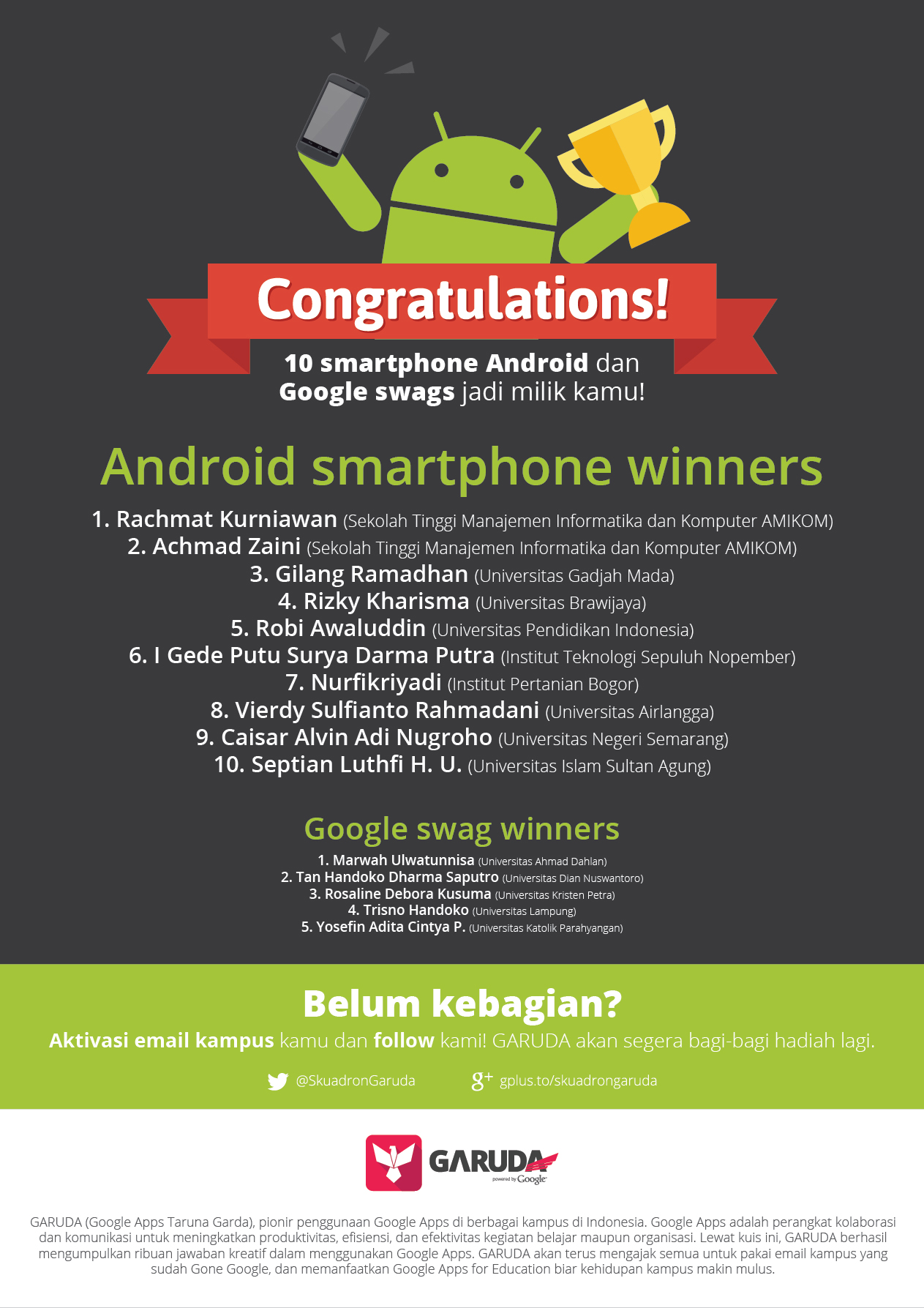 (Unila) : Google Apps Activation Program bulan lalu telah mengadakan kuis Google Apps Taruna Garda (GARUDA). Pengumuman telah dirilis pada 25 Oktober 2013. Salah satu pemenang berasal dari Universitas Lampung yakni Trisno Handoko. Pemenang selengkapnya dapat dilihat di sini.[]