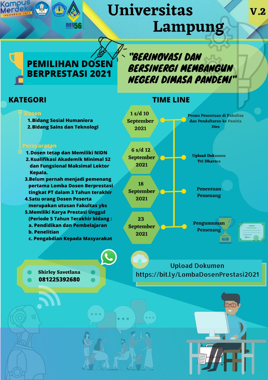 Pengumuman Pemilihan Dosen Berprestasi Unila Tahun 2021 Di update oleh Siti Nuryani - 06/09/2021 0 1057 (Unila): Berikut disampaikan pengumuman Pemilihan Dosen Berprestasi Universitas Lampung (Unila) tahun 2021. []