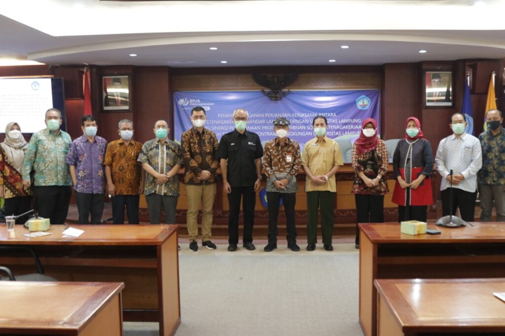Penandatanganan dilakukan di ruang sidang utama lantai 2 Rektorat, Jumat, 26 Februari 2021, disaksikan jajaran pimpinan di lingkungan Kampus Hijau beserta perwakilan BPJS Ketenagakerjaan Cabang Bandarlampung.