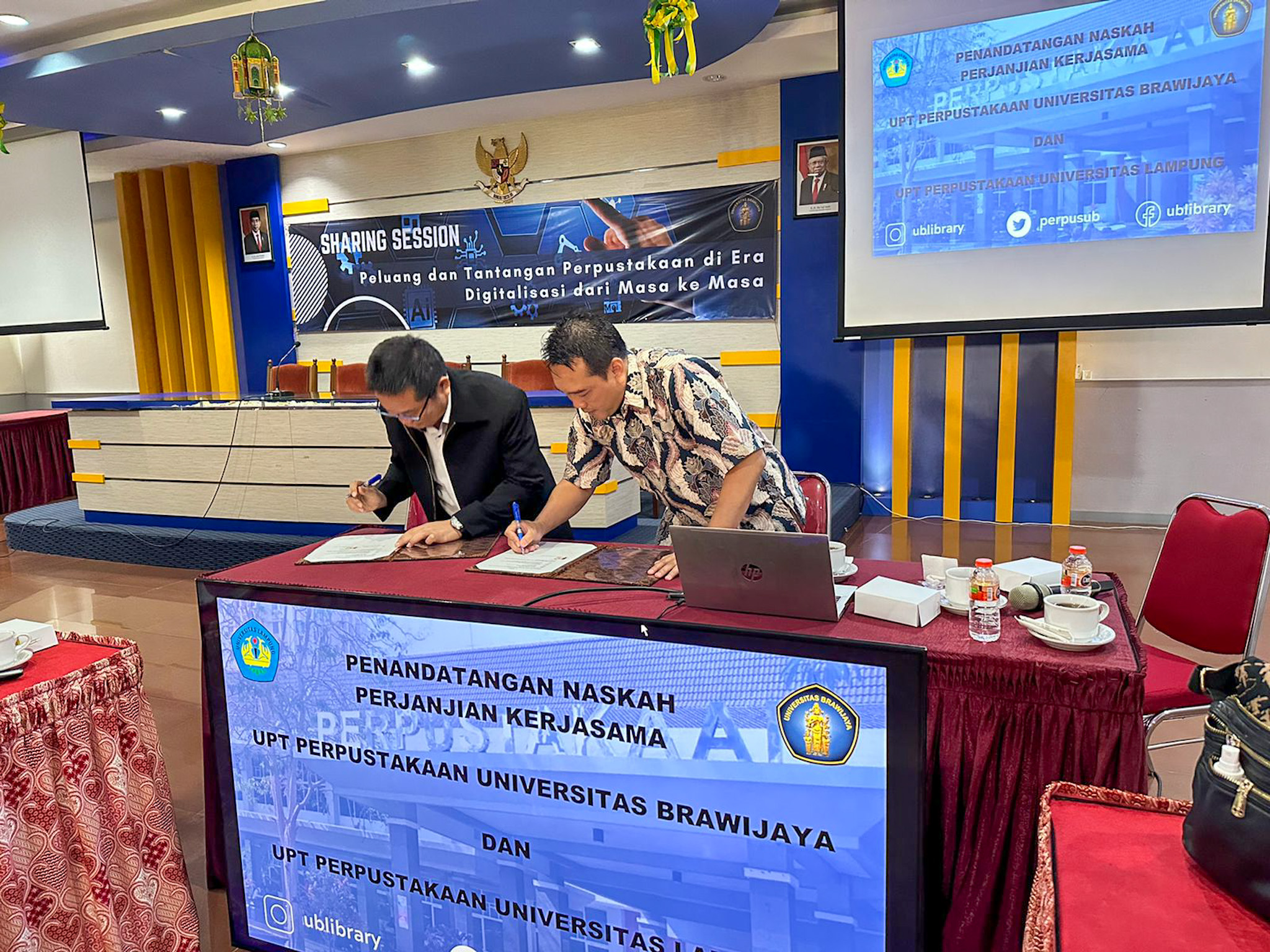 Penandatanganan naskah kerja sama dilakukan antara Kepala UPT Perpustakaan Universitas Brawijaya Dr. Iwan Permadi, S.H., M.Hum., dan Kepala UPT Perpustakaan Universitas Lampung Ir. Khairudin, S.T., M.Sc., Ph.D., Eng., di ruang perpustakaan Universitas Brawijaya.