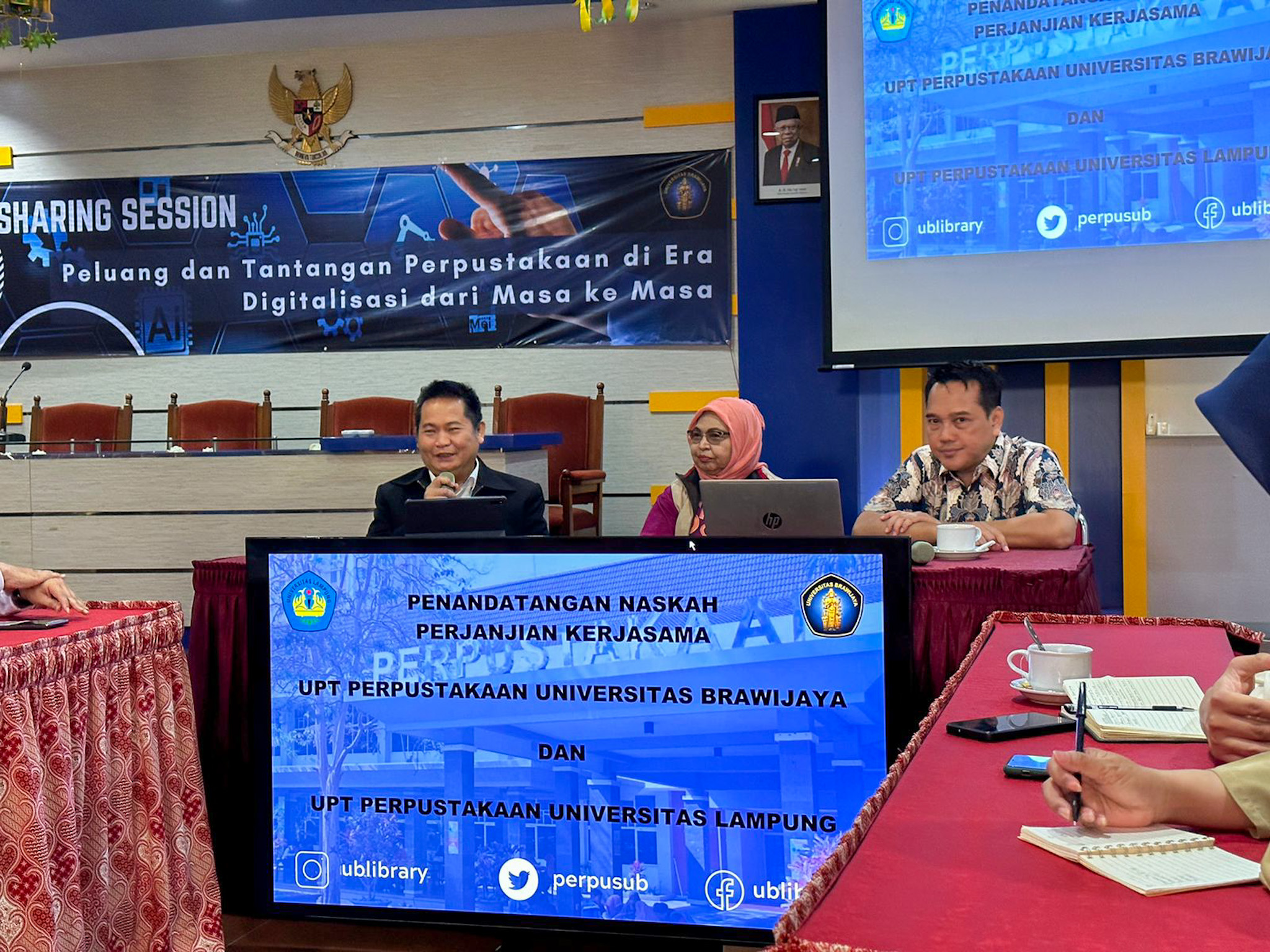 Penandatanganan naskah kerja sama dilakukan antara Kepala UPT Perpustakaan Universitas Brawijaya Dr. Iwan Permadi, S.H., M.Hum., dan Kepala UPT Perpustakaan Universitas Lampung Ir. Khairudin, S.T., M.Sc., Ph.D., Eng., di ruang perpustakaan Universitas Brawijaya.