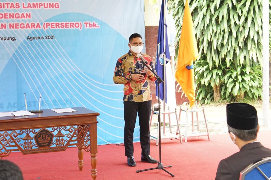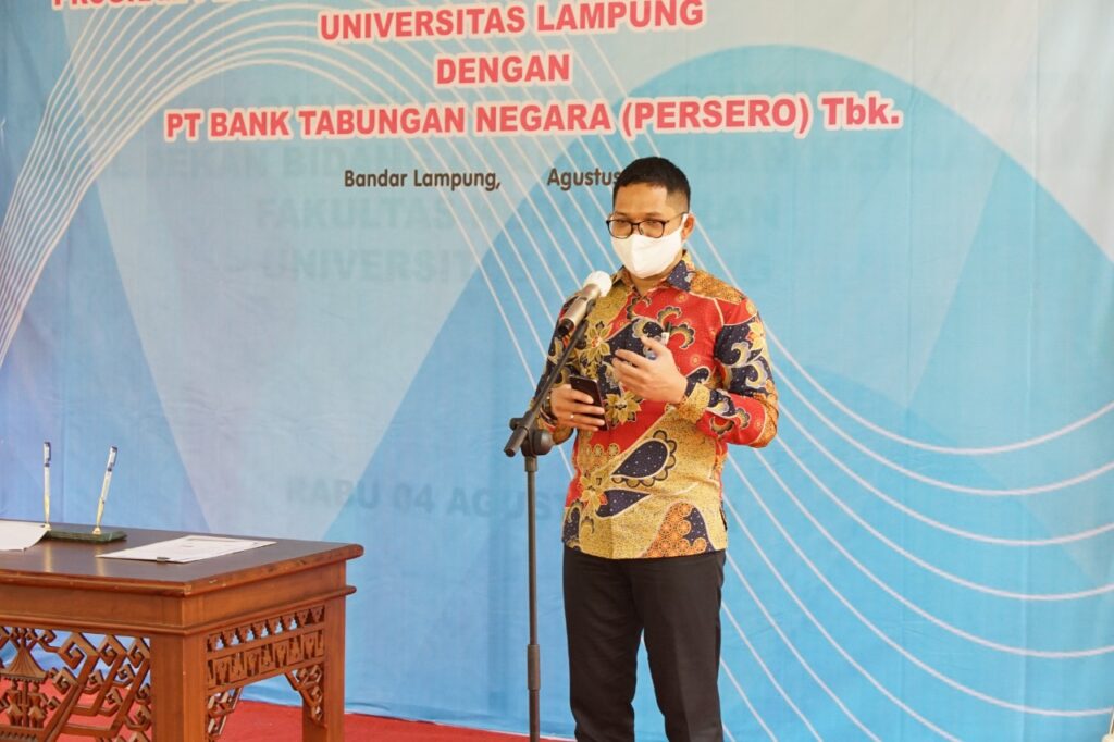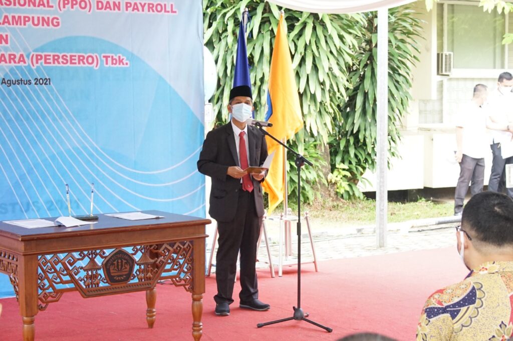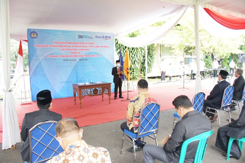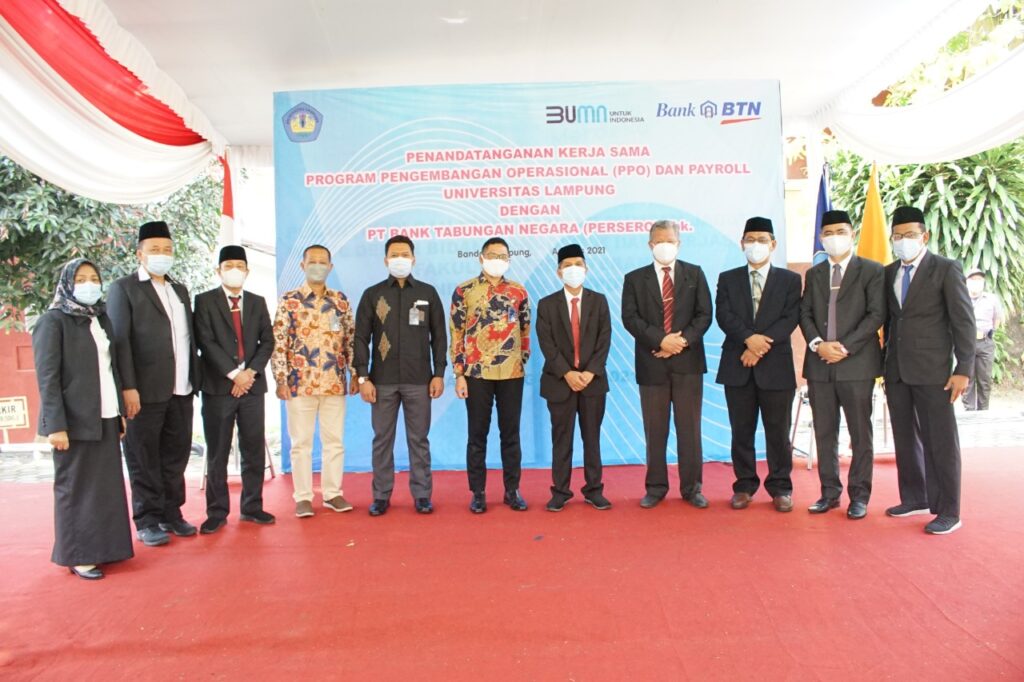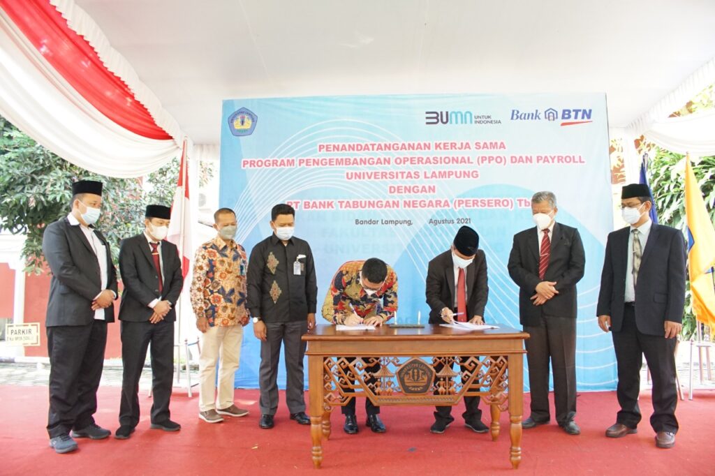 (Unila): Rektor Universitas Lampung (Unila) Prof. Dr. Karomani, M.Si., menandatangani kerja sama Program Pengembangan Operasional (PPO) dan Payroll antara Universitas Lampung dan PT Bank Tabungan Negara (Persero) Tbk, Rabu, 4 Agustus 2021.