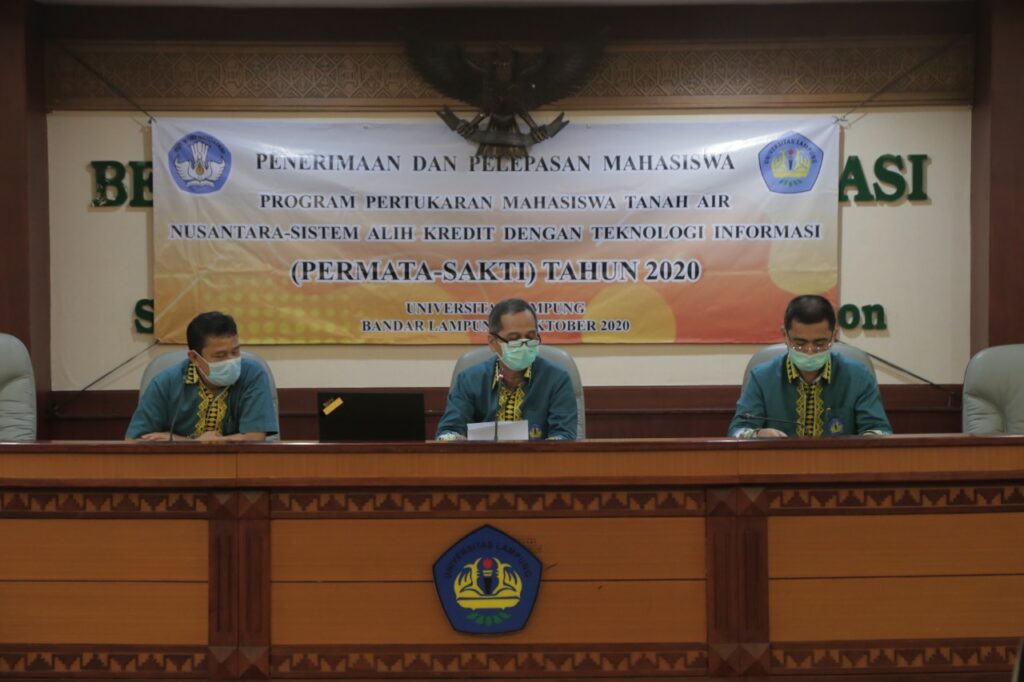 (Unila): Rektor Universitas Lampung (Unila) Prof. Dr. Karomani, M.Si., membuka kegiatan Penerimaan dan Pelepasan Mahasiswa Program Pertukaran Mahasiswa Tanah Air Nusantara-Sistem Alih Kredit dengan Teknologi Informasi (PERMATA-SAKTI) Tahun 2020, Kamis (1/10/2020).