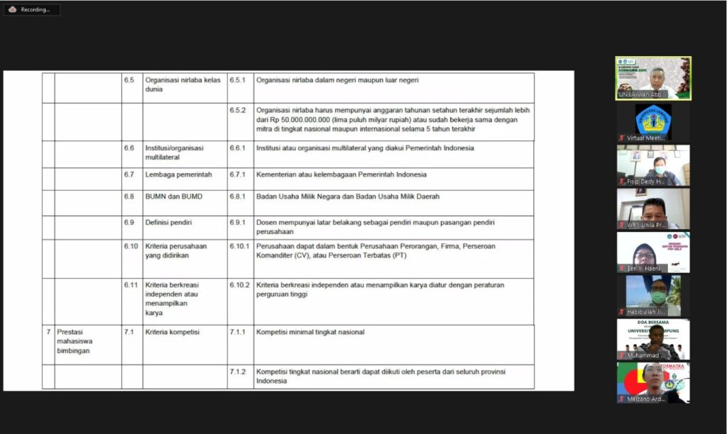 (Unila): Wakil Rektor Bidang Perencanaan, Kerja Sama, dan TIK Universitas Lampung (Unila) Prof. Ir. Suharso, Ph.D., membuka Workshop Pengisian Data Dosen untuk Klasterisasi Perguruan Tinggi via daring, Senin, 26 Juli 2021.