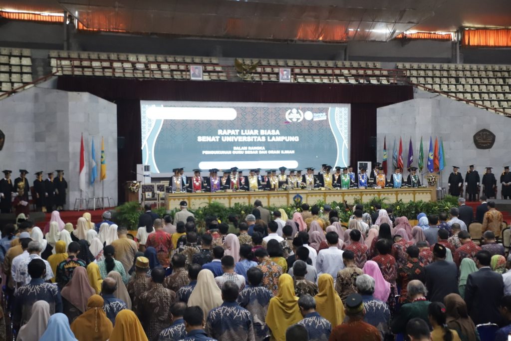 (Unila): Universitas Lampung (Unila) menggelar rapat senat luar biasa dalam rangka pengukuhan guru besar dan orasi ilmiah dengan 9 guru besar dari berbagai bidang keilmuan pada Senin, 9 Desember 2024, di Gedung Serbaguna Unila.