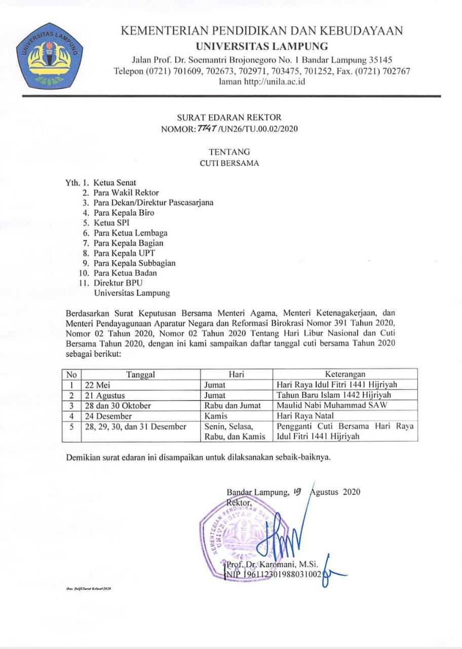 (Unila): Berikut pengumuman tentang cuti bersama di lingkungan Universitas Lampung (Unila) mulai Mei hingga Desember tahun 2020. []