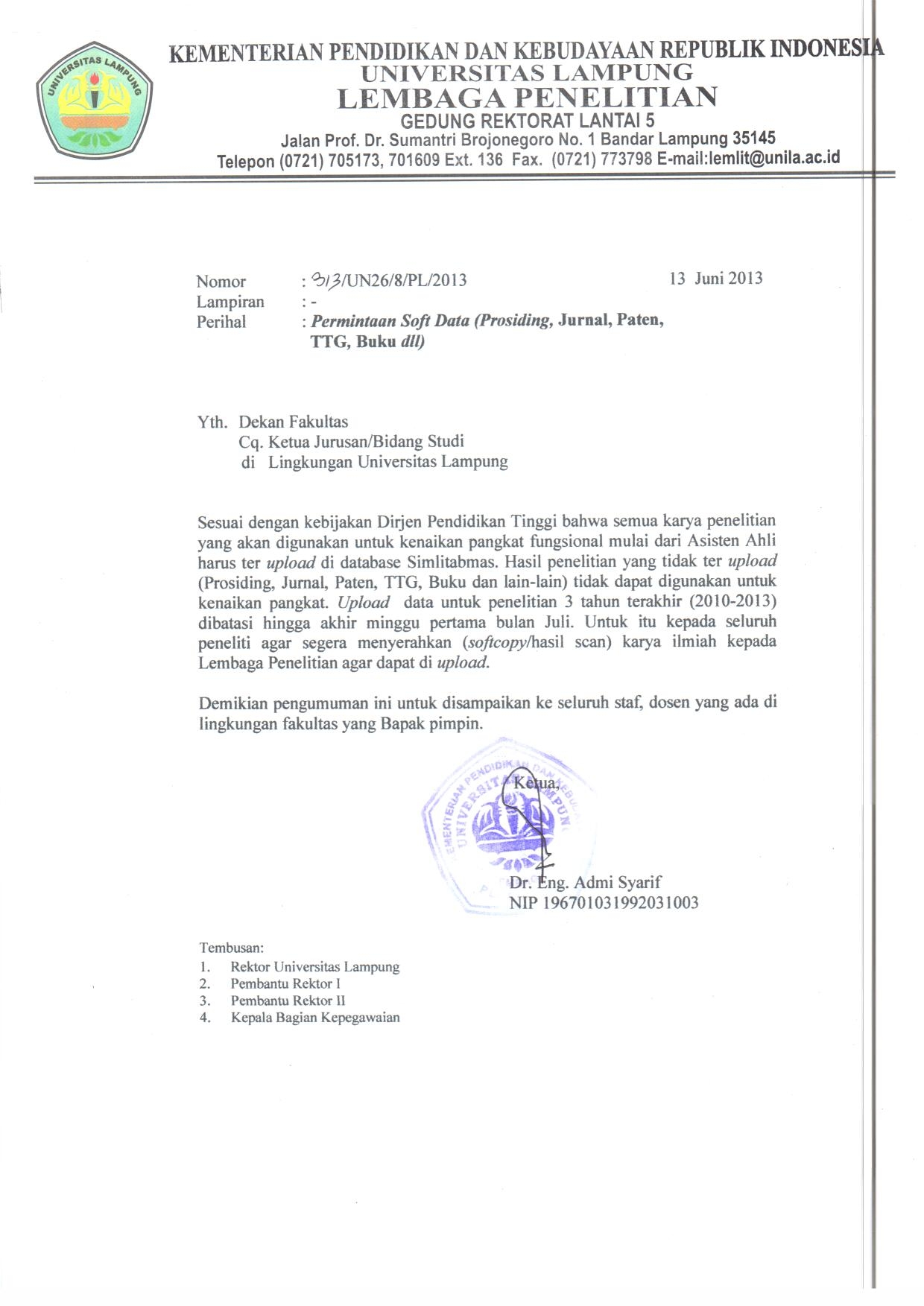 Seluruh peneliti di lingkungan Universitas Lampung (Unila) harap segera penyerahkan (softcopy/hasil scan) karya ilmiah kepada Lembaga Penelitian Unila agar dapat di-upload. Terima kasih.