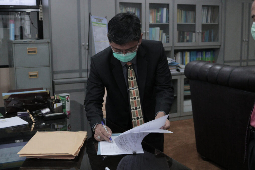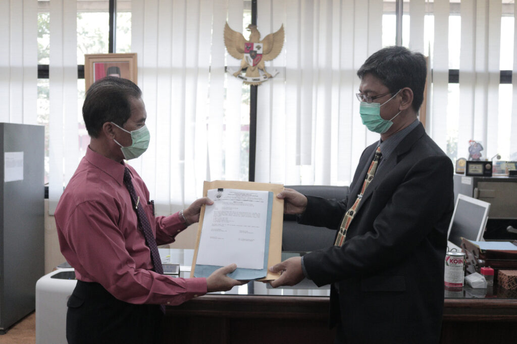(Unila): Wakil Rektor Bidang Umum dan Keuangan Universitas Lampung (Unila) Dr. dr. Asep Sukohar, M.Kes., selaku Ketua Panitia Seleksi menerima penyerahan berkas seleksi Jabatan Pimpinan Tinggi Pratama Kepala Biro Perencanaan dan Hubungan Masyarakat (BPHM) dari Ketua Sekretariat Sariman, S.H., Senin (28/9/2020) di Ruang Kerja WR 2, Gedung Rektorat lantai 2 kampus setempat. []