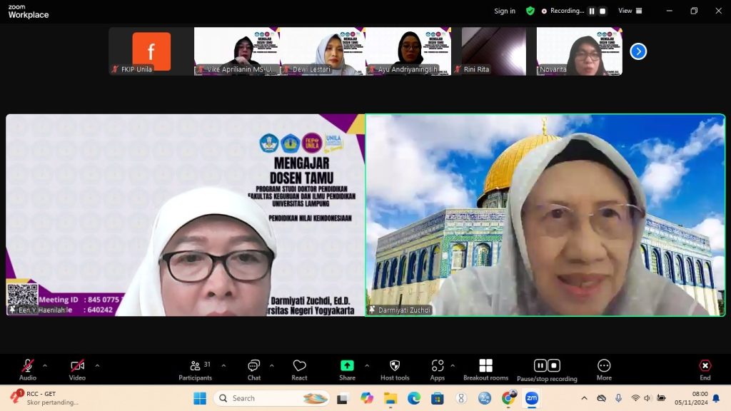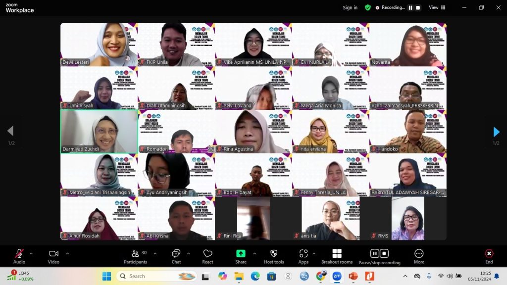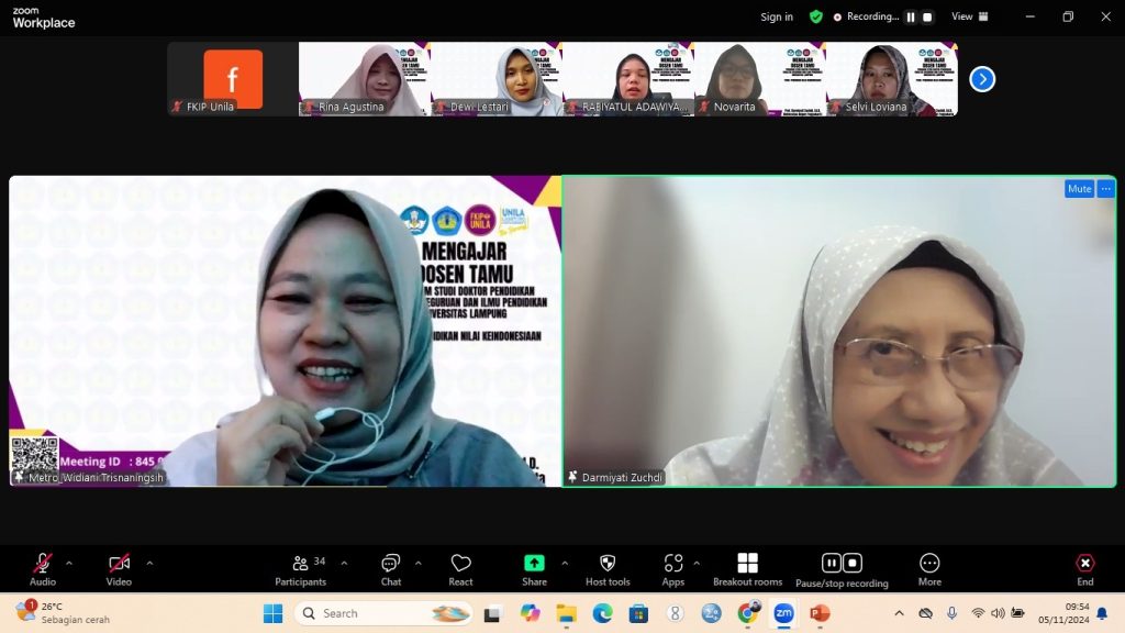 (Unila): Program Studi Doktor Pendidikan (PSDP) FKIP Universitas Lampung (Unila) menyelenggarakan kuliah mengajar dosen tamu melalui zoom meeting, Selasa, 5 November 2024. Kegiatan diikuti dosen dan mahasiswa PSDP FKIP Unila angkatan 2023 dan 2024.