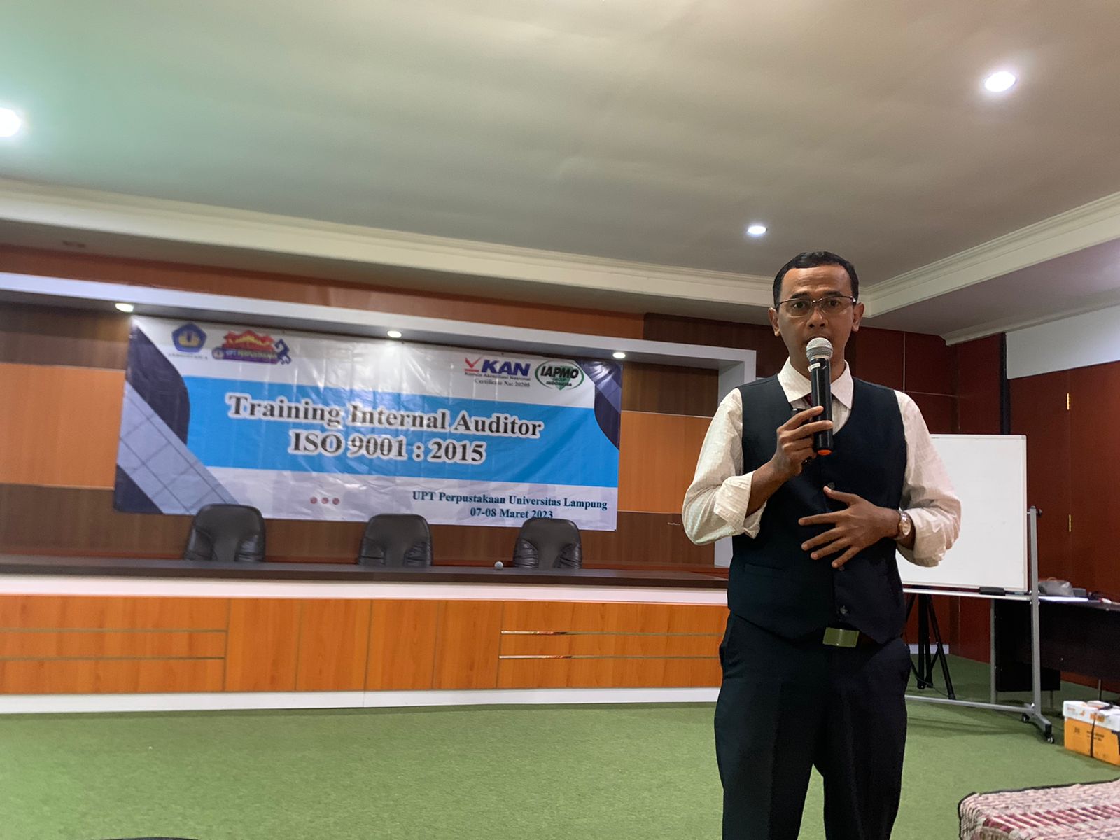 Training Internal Audit ISO UPT Perpustakaan Unila menghadirkan pemateri yakni Sutarji dari PT IAPMO Group Indonesia.